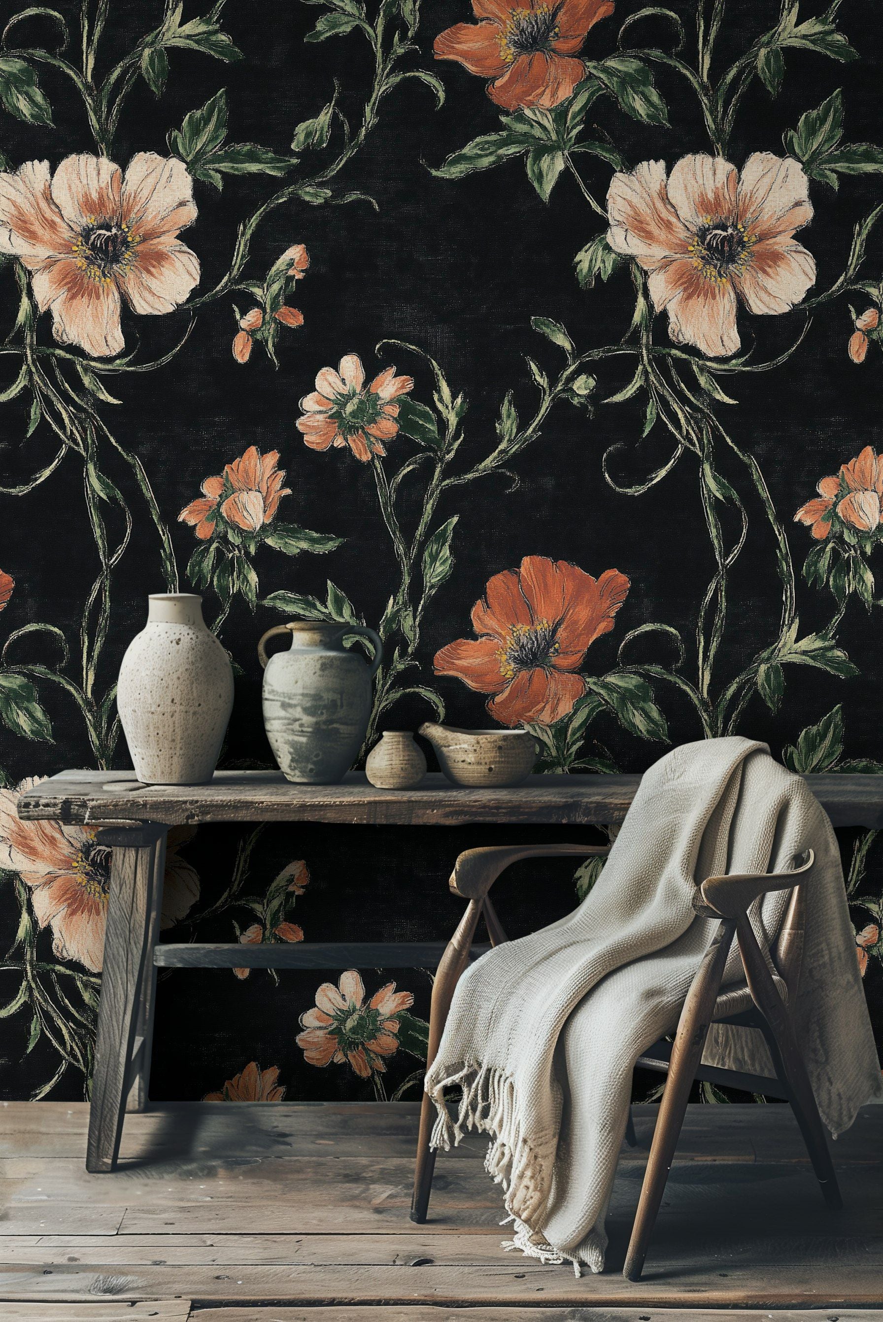Elevate your interior decor with our Black Floral Wallpaper, featuring elegant orange blossoms set against a deep black background. This vintage botanical wall mural brings a sophisticated and dramatic touch to any space, making it ideal for living rooms, bedrooms, or accent walls. Crafted from premium materials, this wallpaper is easy to apply and durable, ensuring your space remains stylish and inviting. Perfect for those seeking a bold yet timeless design.