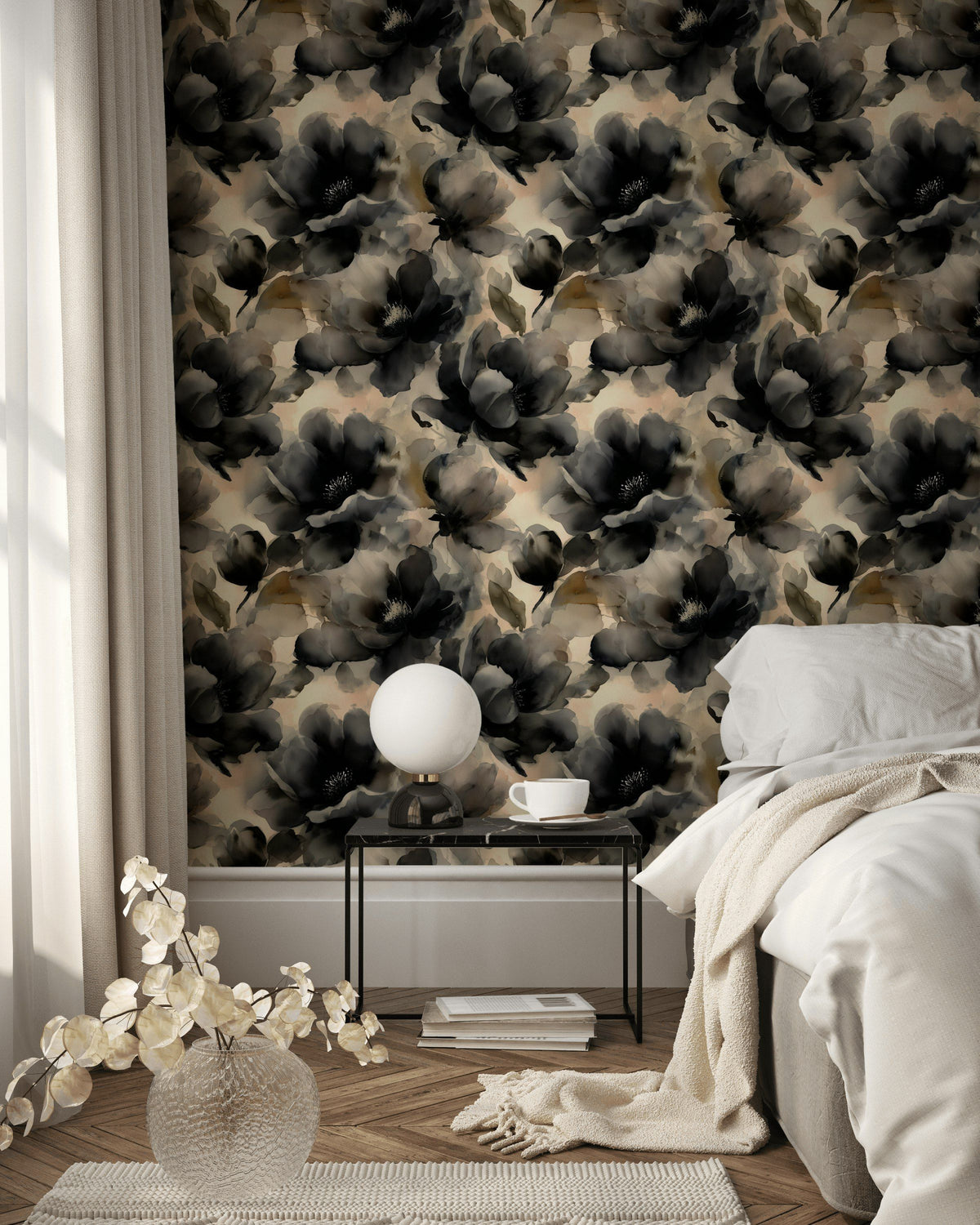 Moody black watercolor flowers bloom across a soft beige background, creating a bold floral pattern. Large-scale blossoms add drama and elegance to your walls.