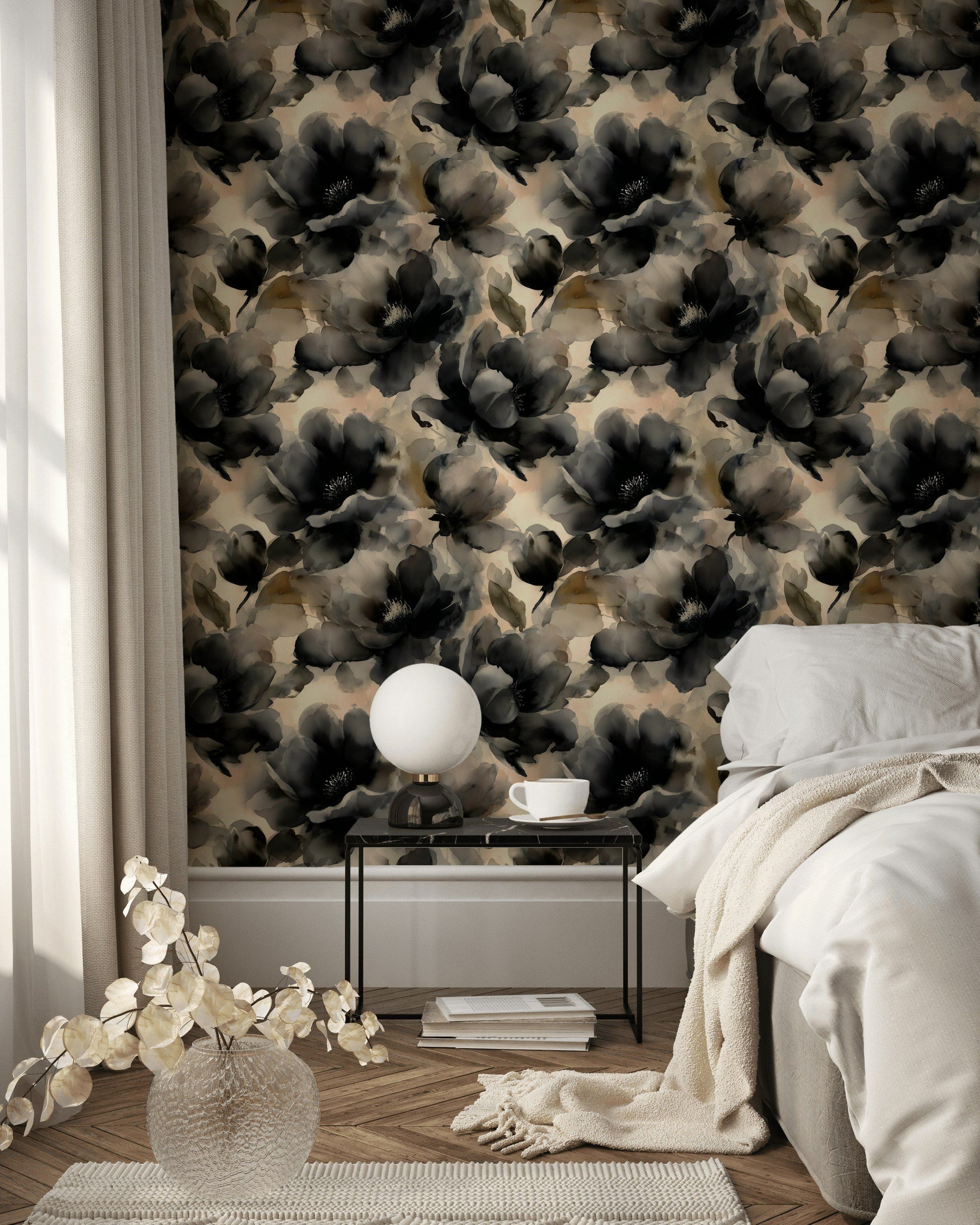 This black floral wallpaper features a watercolor bloom design printed in soft charcoal tones over a creamy base. The painterly layers bring a moody, modern atmosphere while maintaining an organic flow across the surface. Ideal for adding botanical wall character with dark flowers, neutral shades, and a soft texture in contemporary interiors.