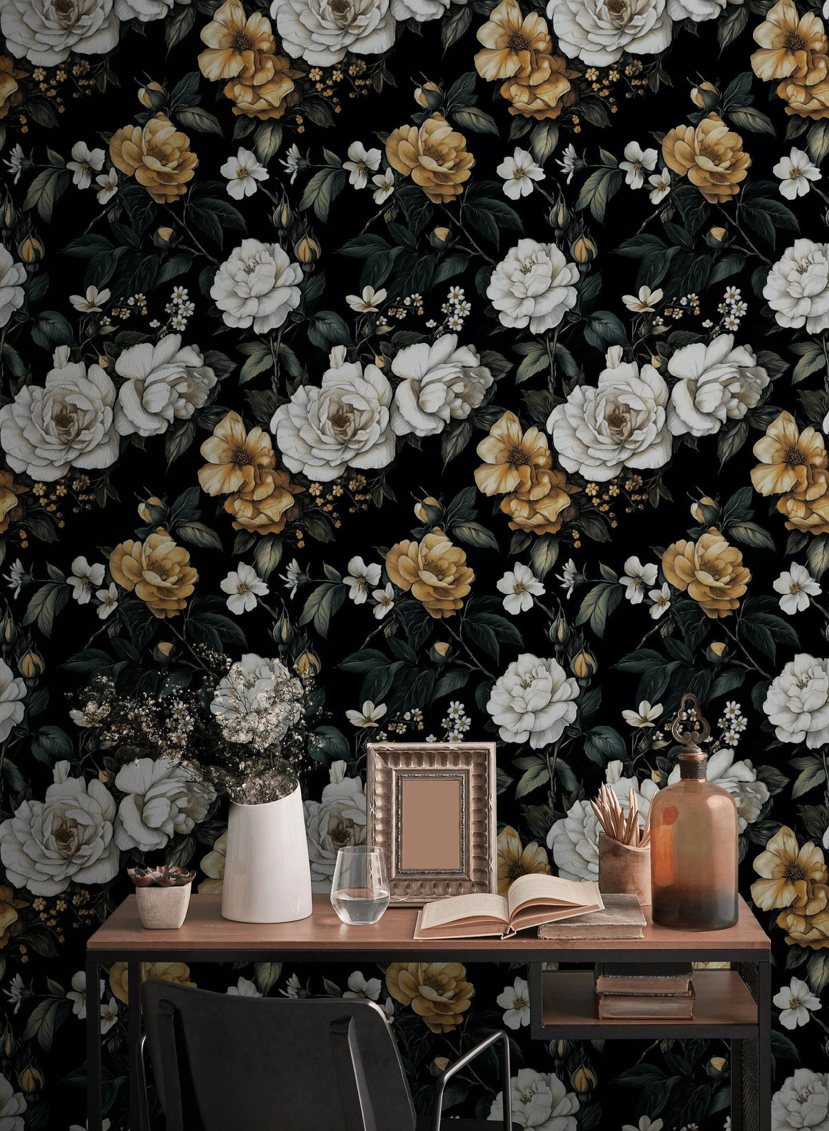 The rose pattern in the Elegant Black and Gold Rose Floral Wallpaper is unique due to its medium-scale design that strikes a balance between boldness and subtlety. The combination of gold and white roses against a deep black background creates an elegant yet dramatic effect, perfect for adding a luxurious touch to any space.