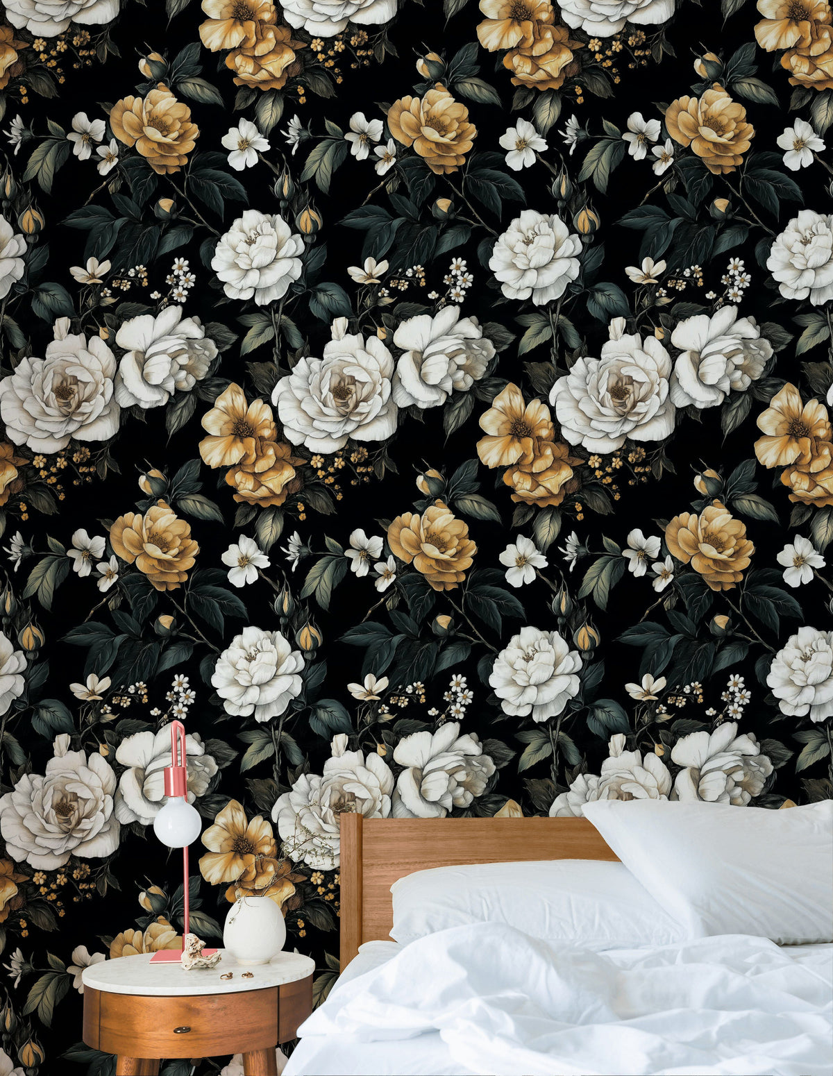 Yes, the Elegant Black and Gold Rose Floral Wallpaper is perfect for a bedroom. Its dark backdrop creates an intimate ambiance, while the gold and white roses add a touch of luxury, making it ideal for a master bedroom feature wall.