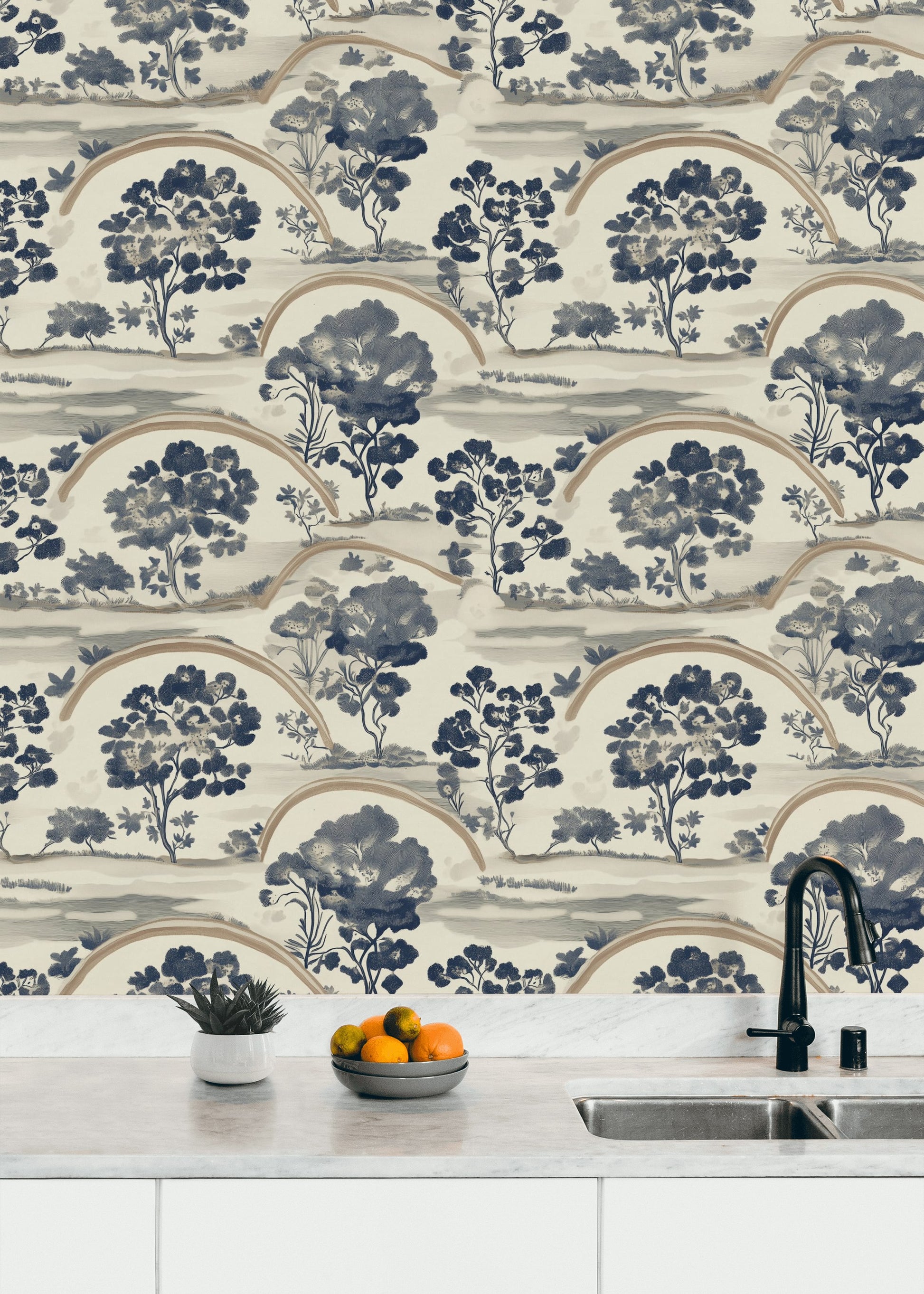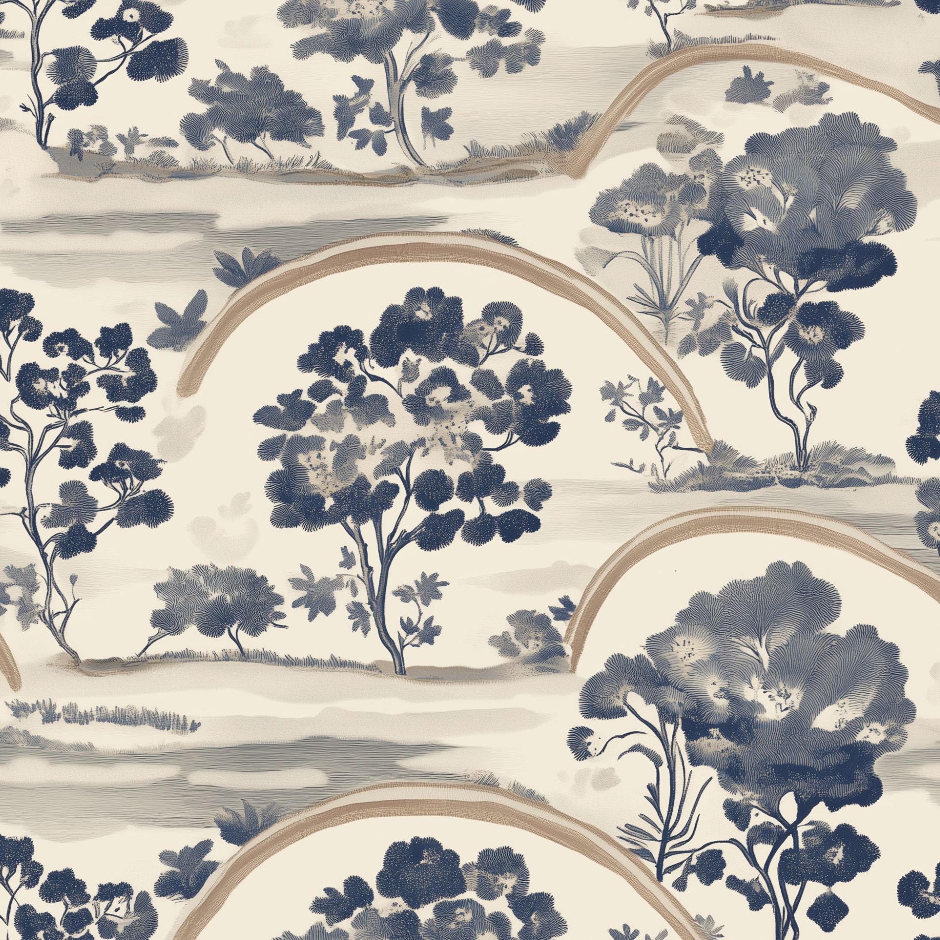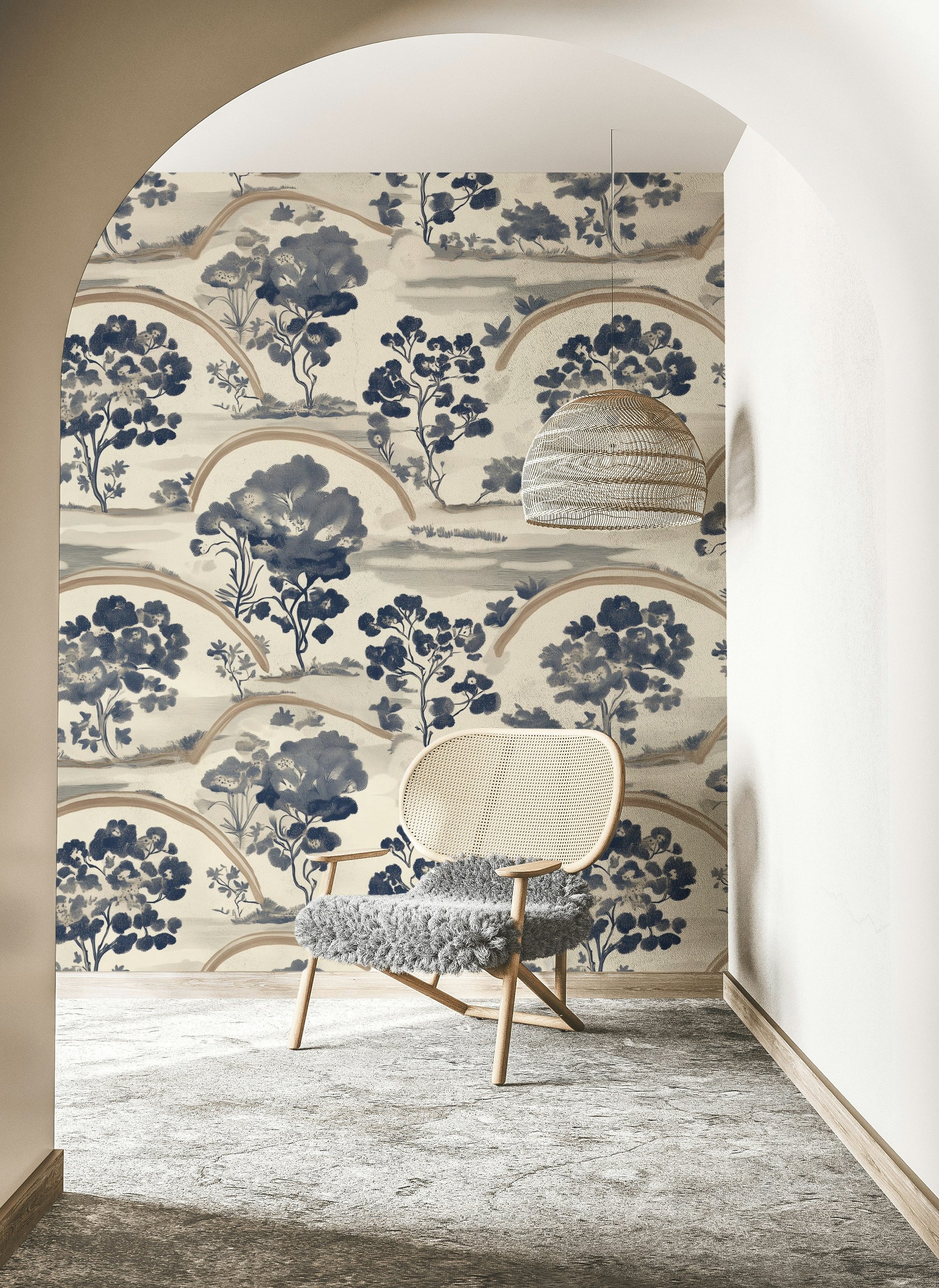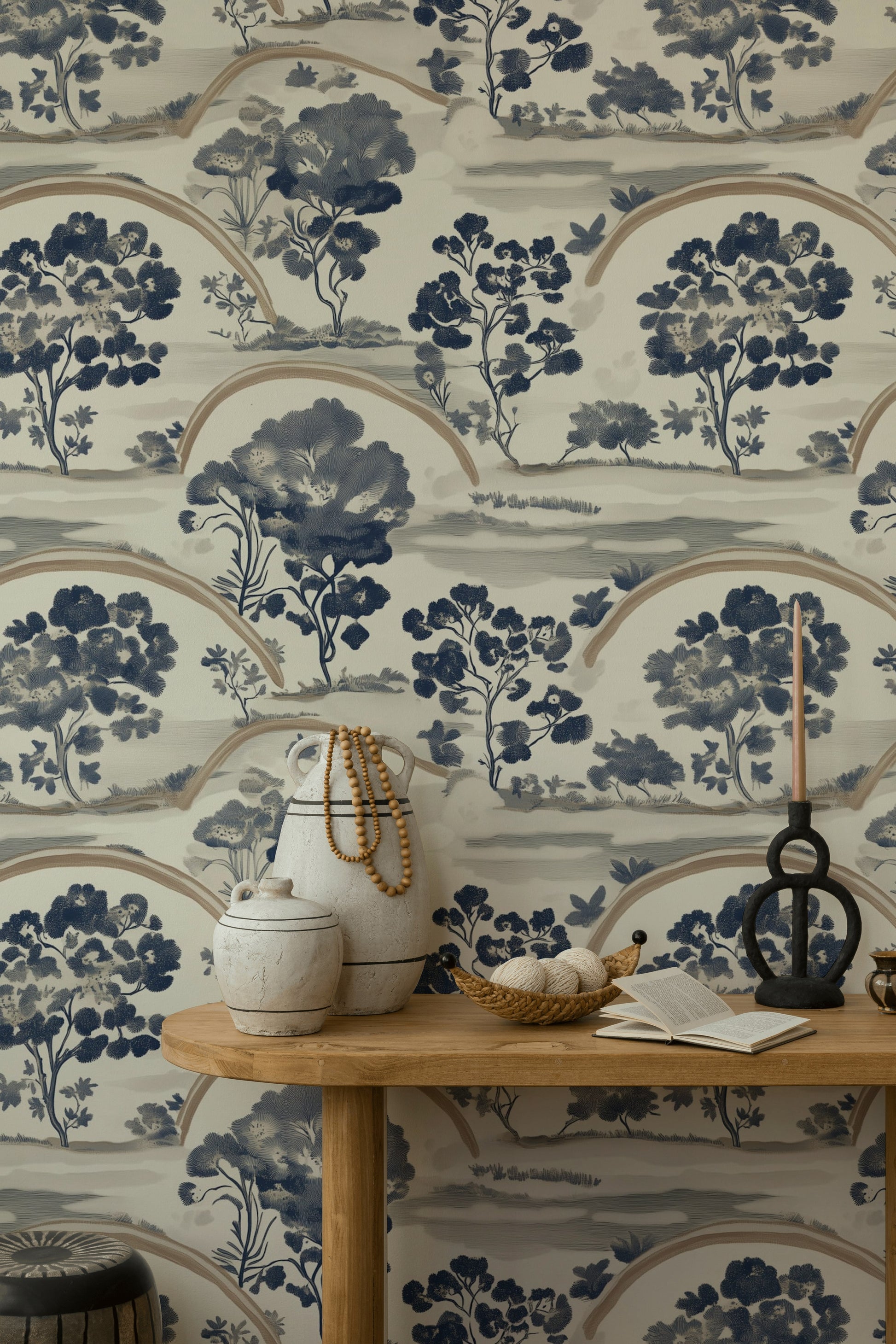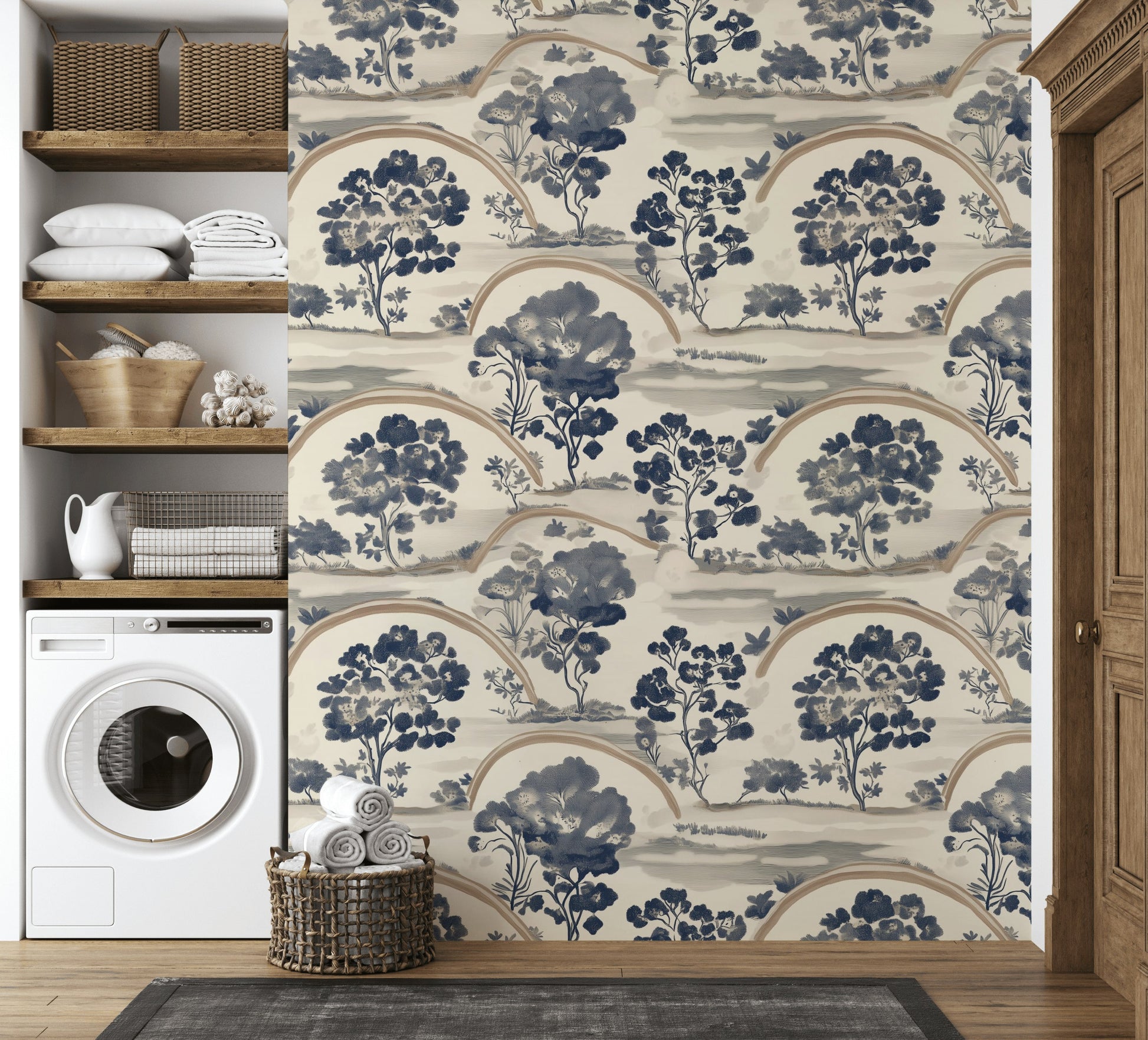 Elevate your home with this blue and white scenic wallpaper featuring delicate trees and rolling landscapes. Inspired by traditional patterns with a modern twist, this design adds a sense of tranquility and timeless beauty to any room. Perfect for dining areas, bedrooms, or classic living spaces, its versatility complements a variety of styles. Available in peel-and-stick or traditional paste options for easy application. Infuse your walls with artistry and charm.