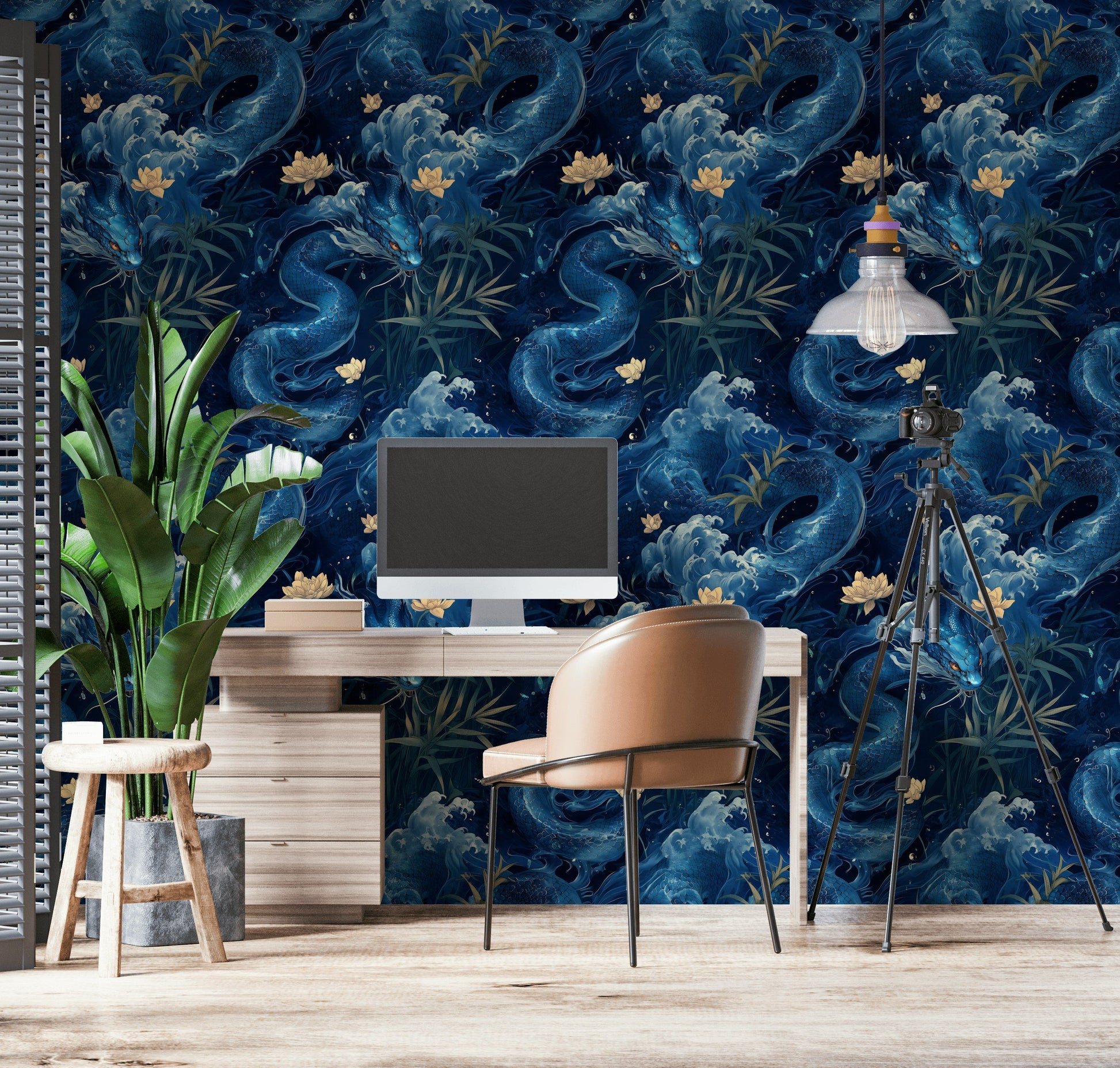 This wallpaper features a blue dragon winding through watercolor waves and lotus flowers, bringing together elements of Japanese koi, mystical floral wall design, and a night blue color palette. Printed with bold dragon wallpaper details and gold lotus accents, this peel and stick mural is both removable and easy to install. The flowing, abstract patterns are inspired by Asian art, with blue dragon, koi fish, and bold art influences. Finished with a watercolor effect and intricate floral touches, this piece brings a mystical and modern atmosphere to any space.