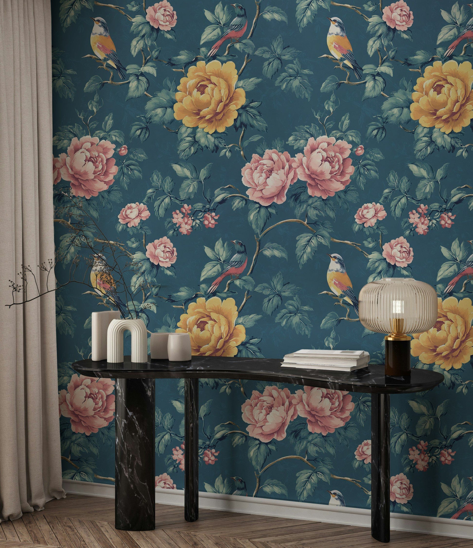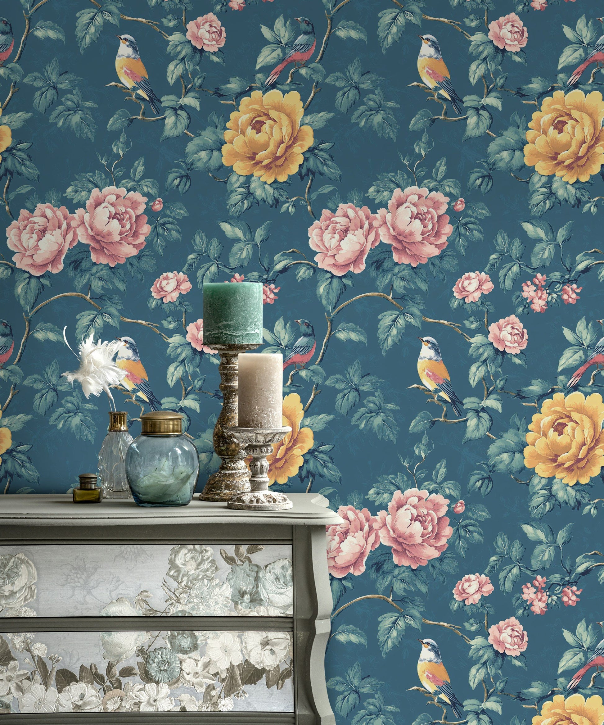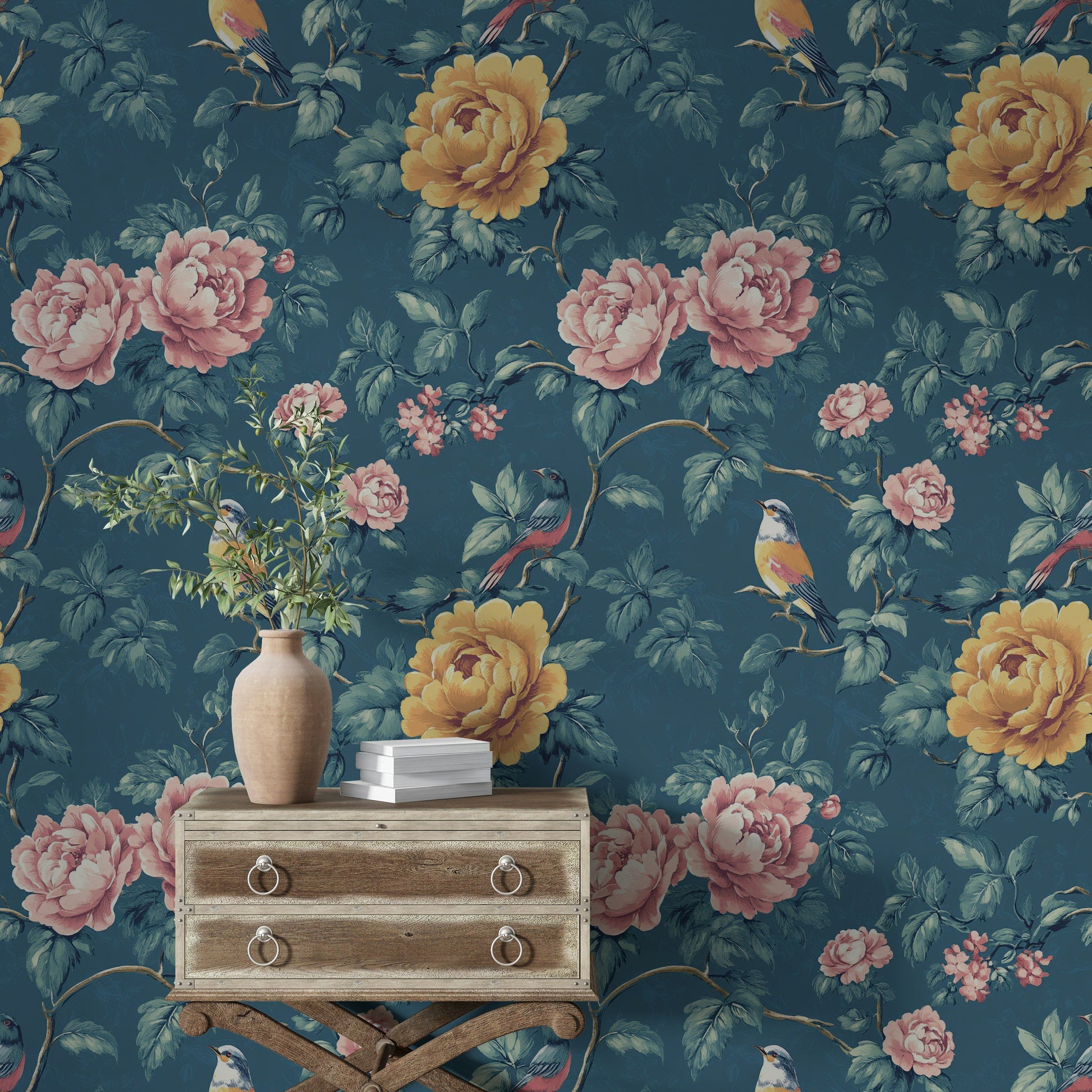 Add a touch of vintage charm to your home with our Blue Floral & Bird Wallpaper, featuring beautiful pink and yellow peonies along with delicate birds set against a rich blue background. This stunning botanical wall mural is perfect for creating a serene and elegant atmosphere in any room, from bedrooms to living rooms. Made with premium materials, this wallpaper is both easy to apply and long-lasting, offering a stylish and sophisticated decor solution for your space.