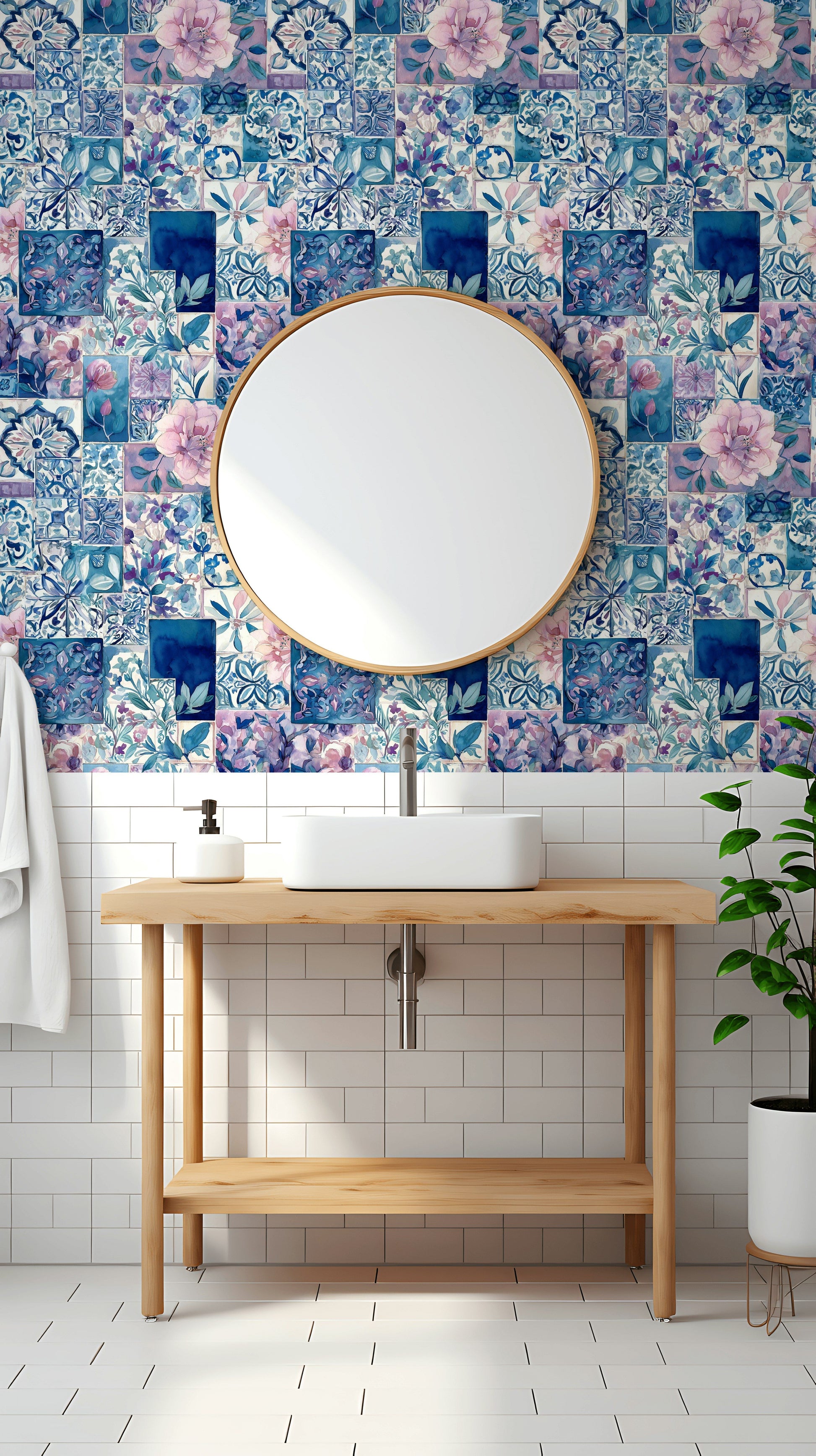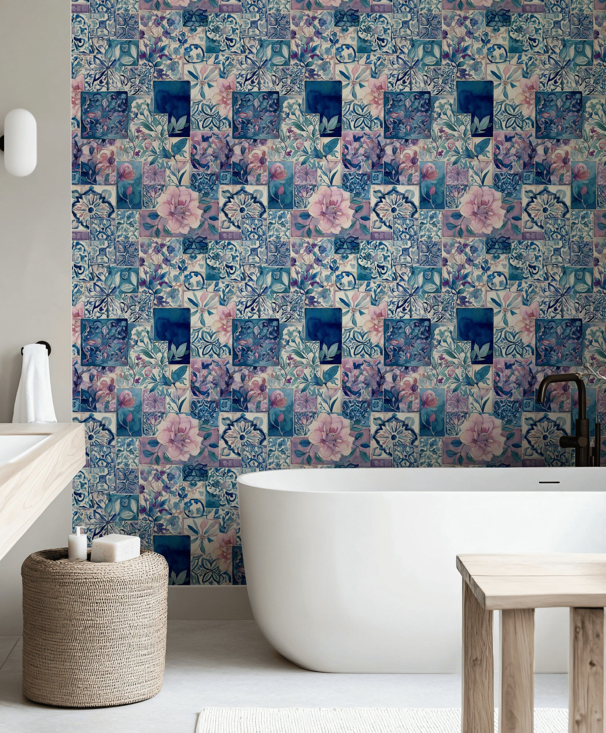 This patchwork mural blends blue floral tiles and watercolor botanical motifs for a vibrant, artistic effect. The mix of pink flowers, indigo pattern work, and geometric art creates a distinctive mosaic style. Designed with soft pastels and a vintage look, it suits boho decor or eclectic interiors. Each tile pattern reveals unique watercolor detail that adds warmth and movement to any wall.