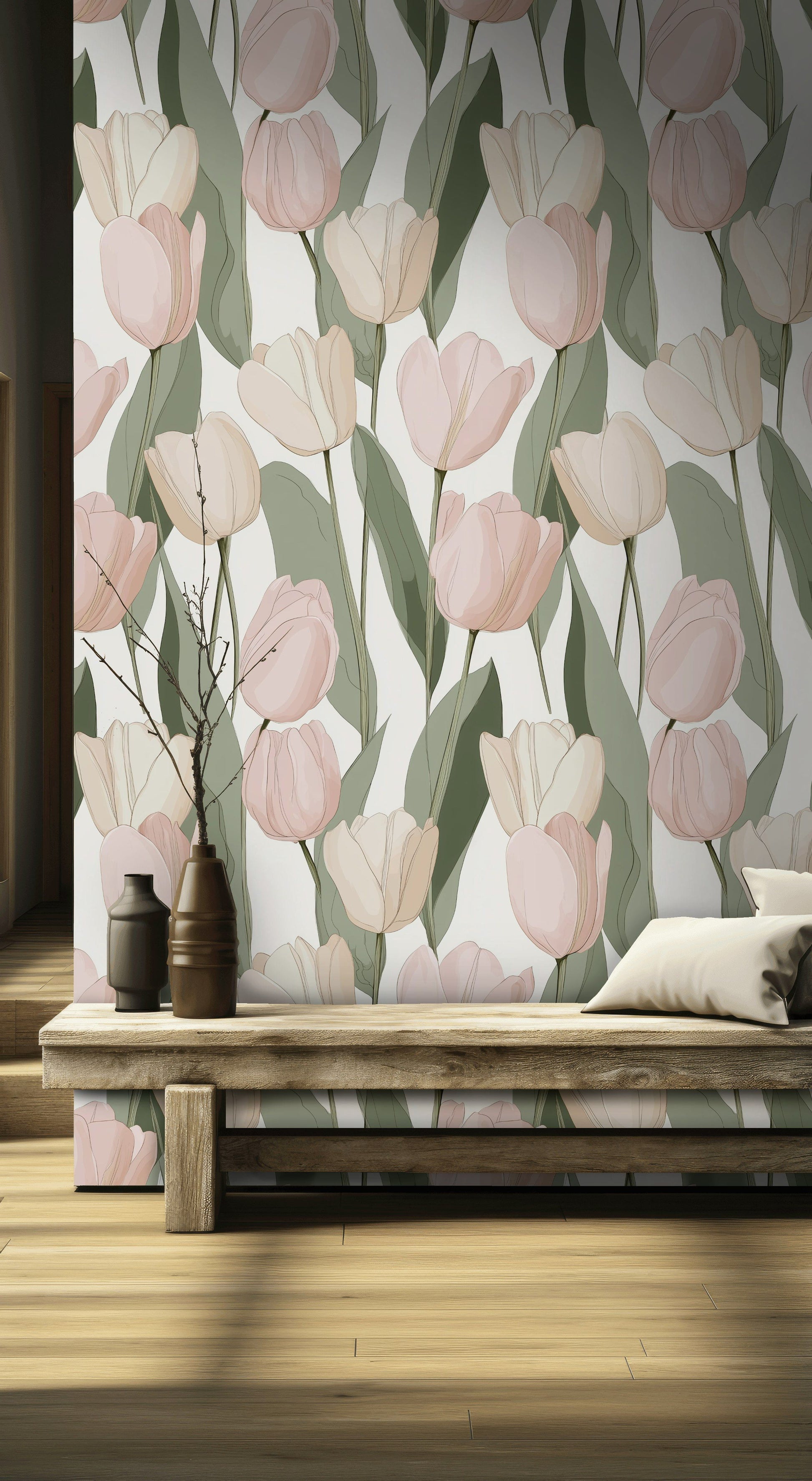 This peel and stick wallpaper features large blush and ivory tulips with delicate sage green leaves for a modern botanical look. The floral pattern is finished in soft pastel tones, blending tulip wallpaper, feminine style, and a calming palette. Designed for easy application, this mural brings a fresh spring mood to bedrooms, nurseries, or contemporary living spaces.