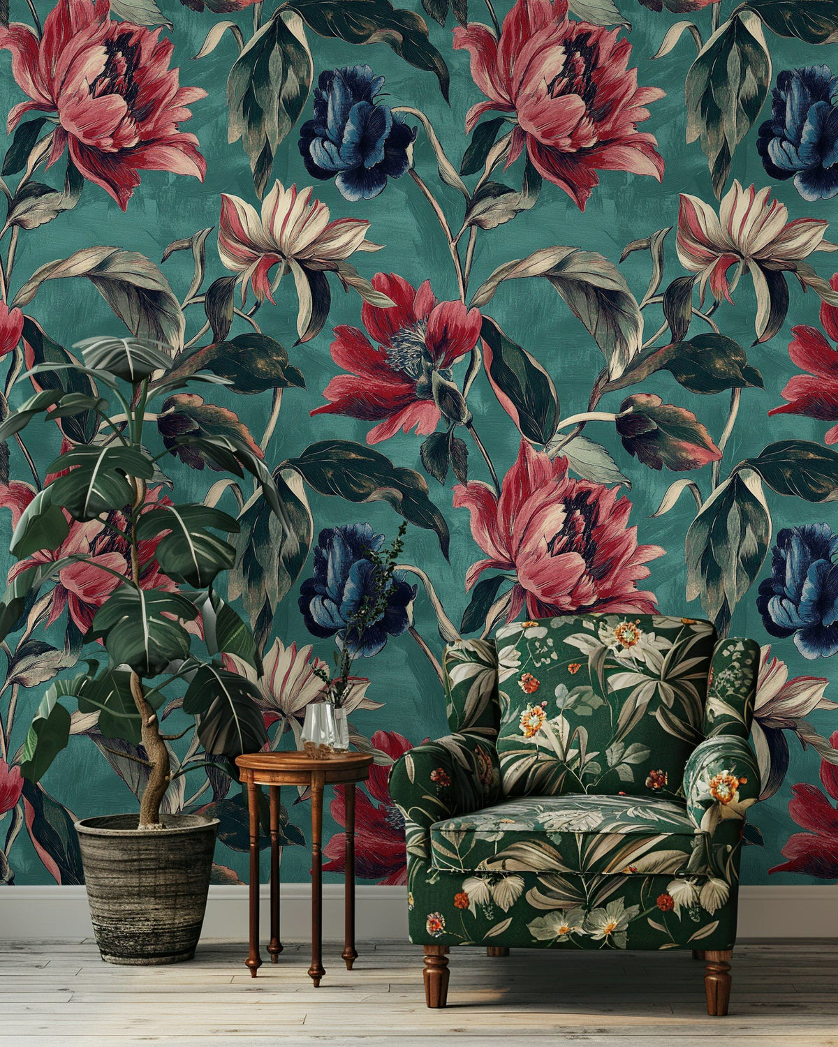 The dark background of the Teal and Burgundy Large Floral Wallpaper enhances the vivid florals, making it an excellent choice for modern decor. It pairs well with contemporary furnishings, such as mid-century modern or minimalist pieces, adding depth and elegance to any room.