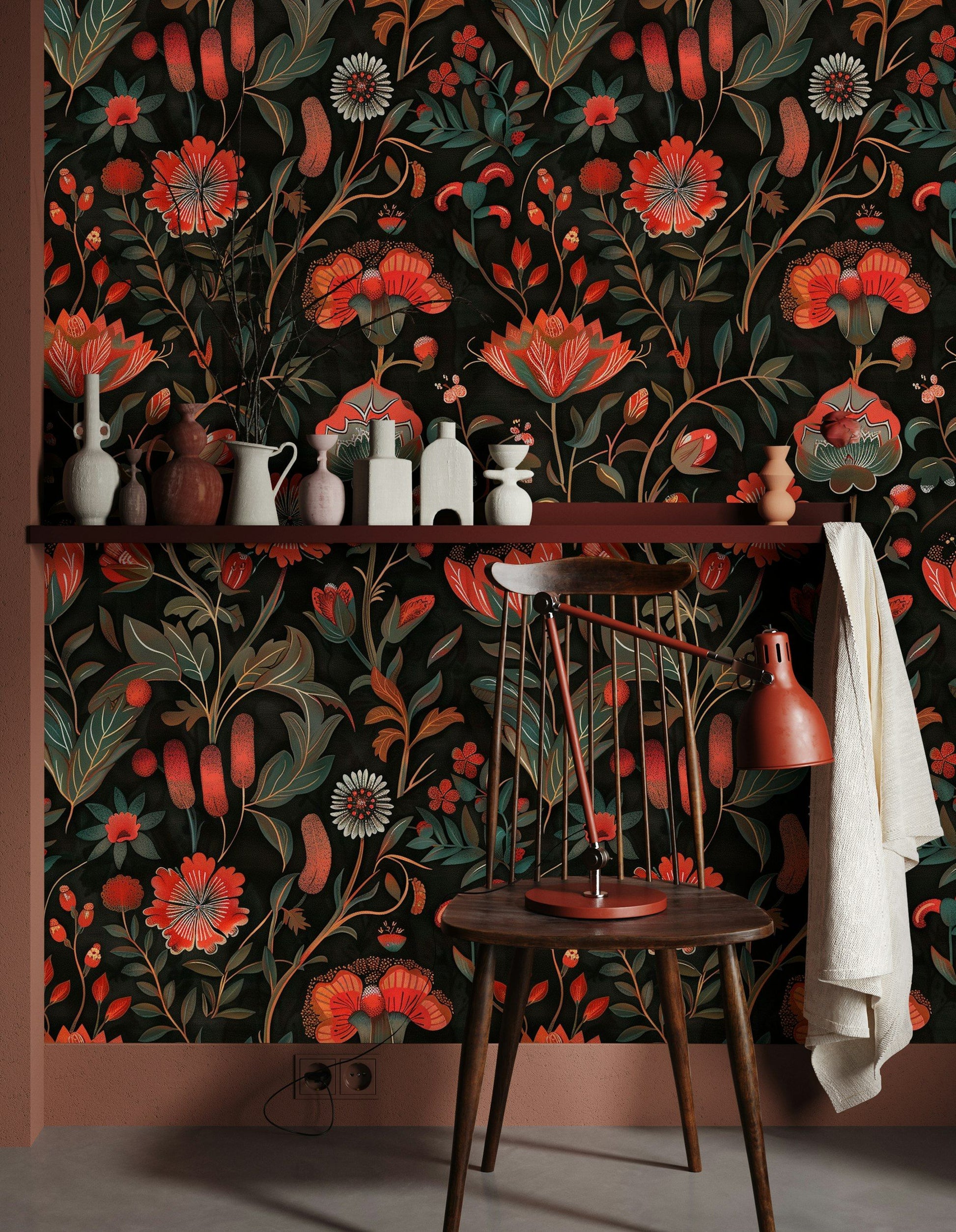 Enhance your home decor with this bold and vibrant dark floral wallpaper. Featuring an array of red, orange, and green botanical elements against a deep black background, this wallpaper brings a sense of elegance and sophistication to any room. The rich colors and intricate details create a dramatic and captivating look, perfect for adding a touch of modern flair and natural beauty.Ideal for living rooms, bedrooms, or any space that seeks a blend of contemporary vibrancy and classic charm. This wallpaper is perfect for creating a feature wall that stands out with its striking beauty and artistic flair.