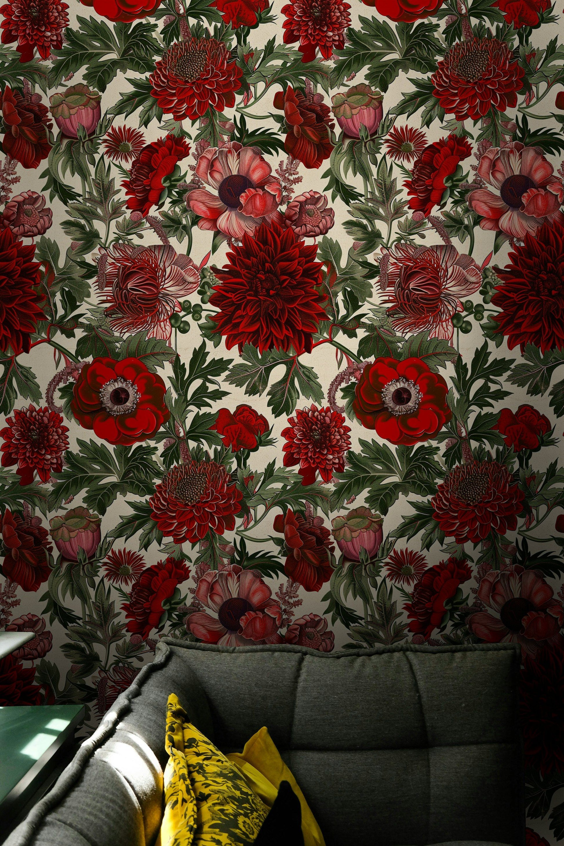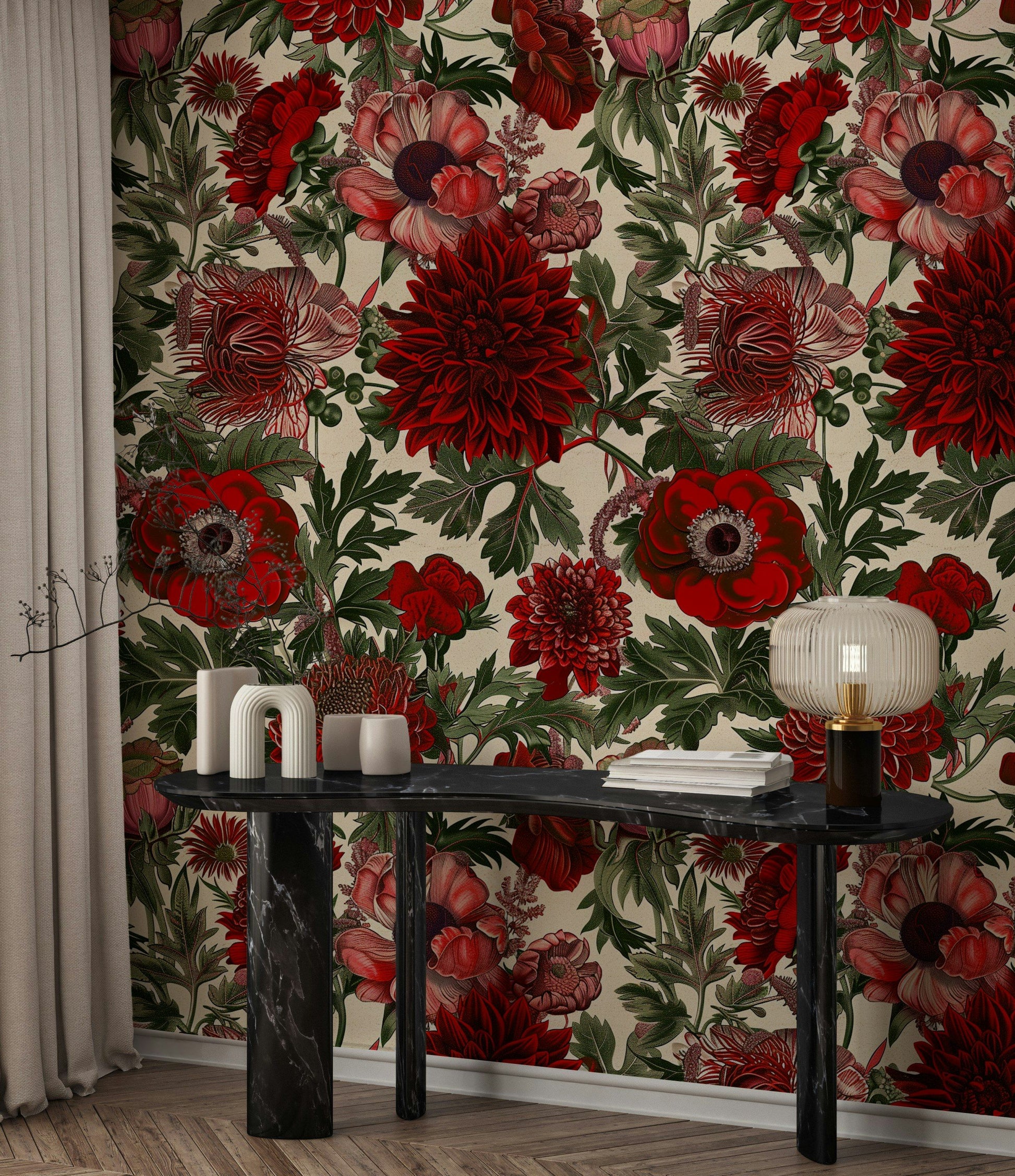 Enhance your home with this stunning bold red floral wallpaper. Featuring a striking array of vibrant red and pink flowers against a light background, this wallpaper adds a touch of elegance and sophistication to any room. The rich colors and intricate details create a captivating look, perfect for adding a touch of modern flair and natural beauty.Ideal for living rooms, bedrooms, or any space that seeks a blend of contemporary vibrancy and classic charm. This wallpaper is perfect for creating a feature wall that stands out with its striking beauty and artistic flair.