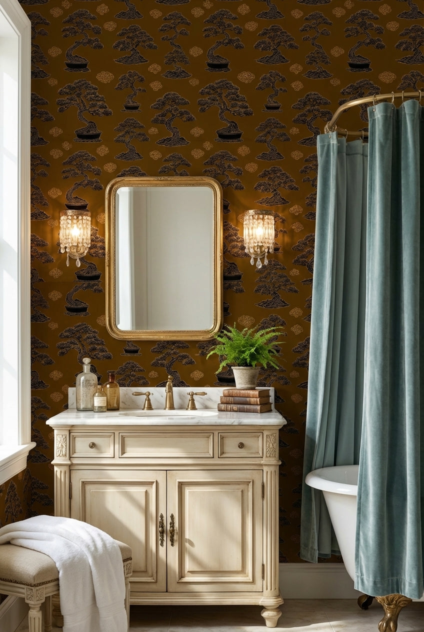 This elegant mural includes bonsai trees and cloud patterns in a chinoiserie style. The brown, black, and gold colors give it a traditional Asian feel, making it a beautiful addition to nature-inspired decor.