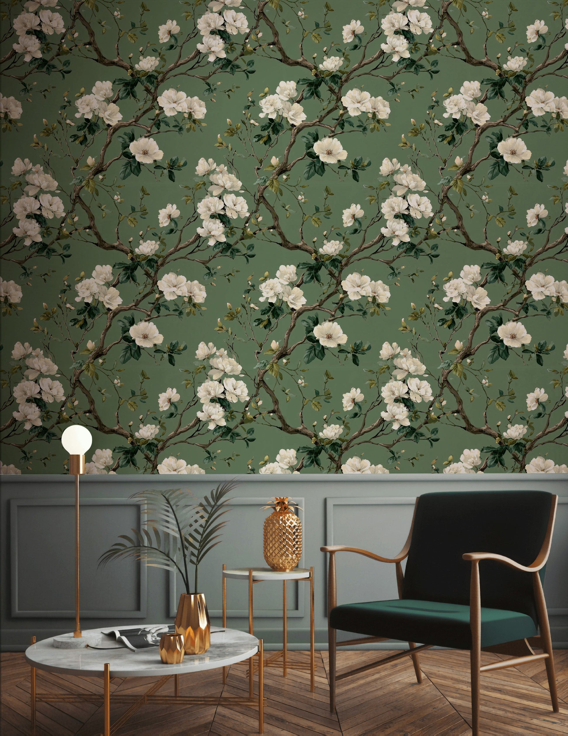 This traditional floral wallpaper showcases blooming white blossoms and natural branches over a soft green backdrop. The vintage-inspired botanical print blends classic charm with modern color balance. Perfect for adult interiors, this wall mural suits garden, cottage, and nature-themed rooms, creating a calm and timeless setting.
