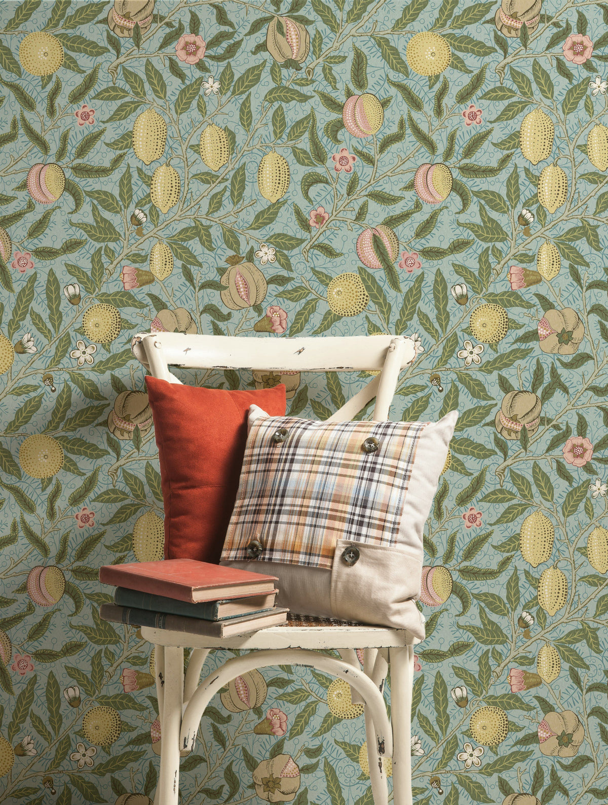 This wallpaper shows a repeating vine pattern with fruit, leaves, and small blossoms. It features a muted blue background with olive green foliage and tan fruit with pink accents in a vintage botanical illustration style. Suitable for living rooms, bedrooms, and dining rooms.