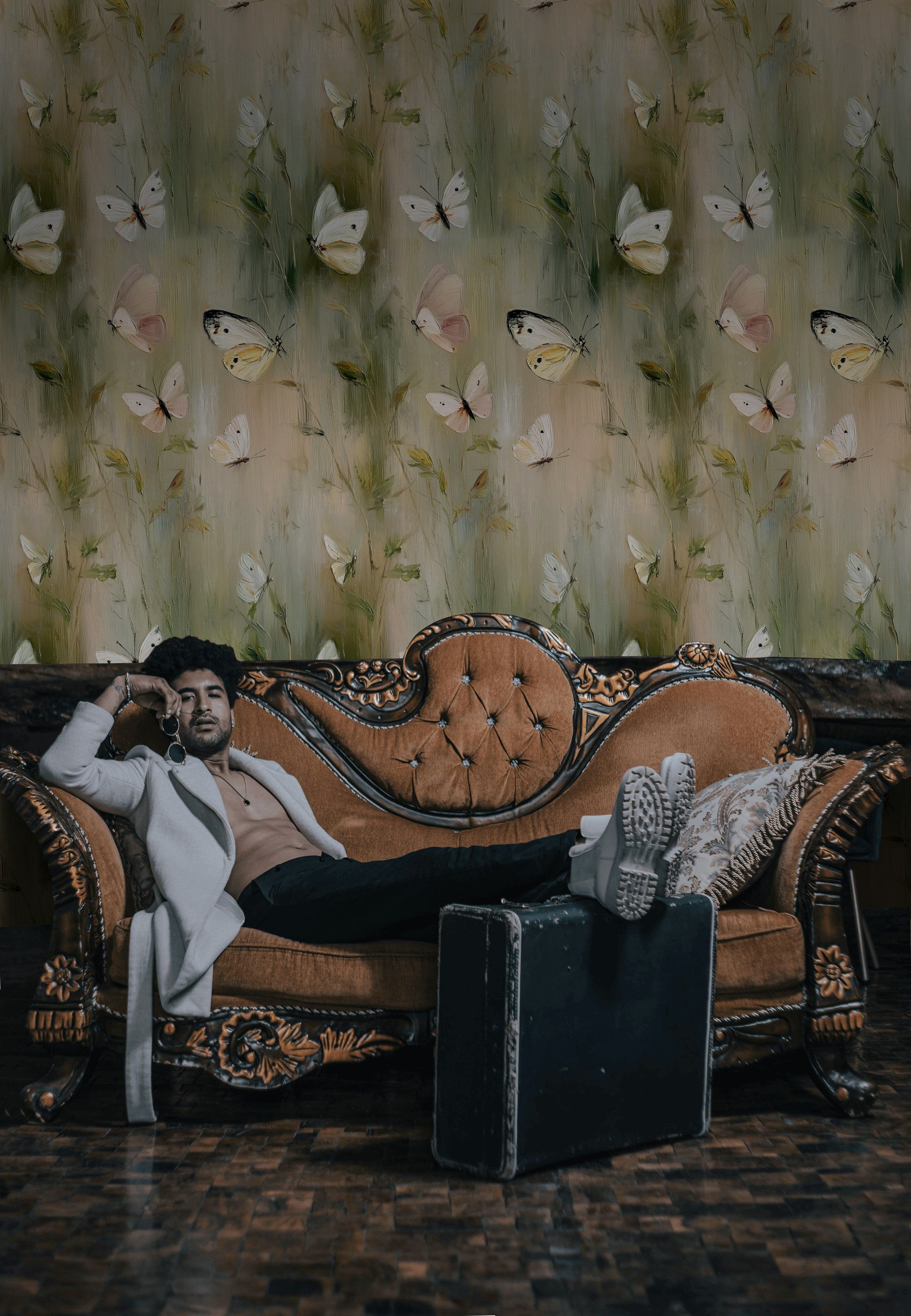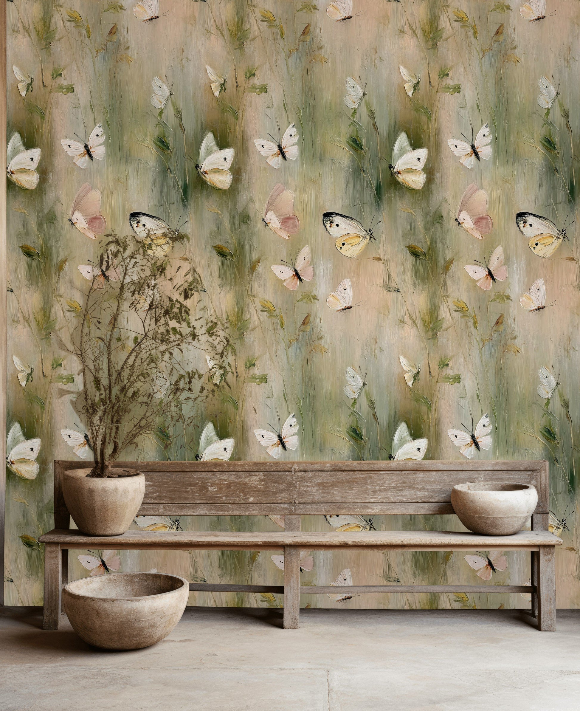 This peel and stick decorative mural features soft pastel butterflies flying above a floral mural of wildflowers in gentle pink, cream, and green tones. The painterly mural blends natural decor elements with a subtle, muted wallpaper palette for calming interiors. Designed to add a delicate butterfly wallpaper effect, it suits vintage and cottage Americana styles as well as modern spaces. The cream butterfly and pink floral accents create a gentle design that enhances any room with timeless charm.