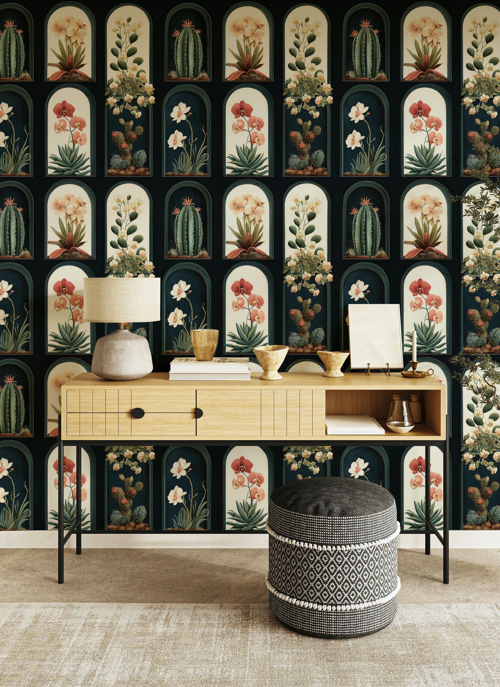 Transform your space with our unique Cactus & Orchid Wallpaper! This stunning wall mural features a captivating arrangement of cacti, succulents, and delicate orchids displayed within elegant architectural arches. Perfect for adding a touch of sophisticated desert charm to your living room, bedroom, office, or any space needing a touch of botanical beauty. Crafted with high-quality, durable materials, our wallpaper is designed for long-lasting beauty and easy installation. Choose between traditional pre-pasted wallpaper for a lasting installation or removable peel-and-stick vinyl for temporary decorating! Enjoy a seamless and professional-looking finish with minimal effort. Elevate your interior design with this eye-catching and artistic wall mural. Its rich, dark background contrasts beautifully with the vibrant plant life, creating a visually stunning and unique aesthetic. Bring the beauty of the desert indoors with our Cactus & Orchid Wallpaper