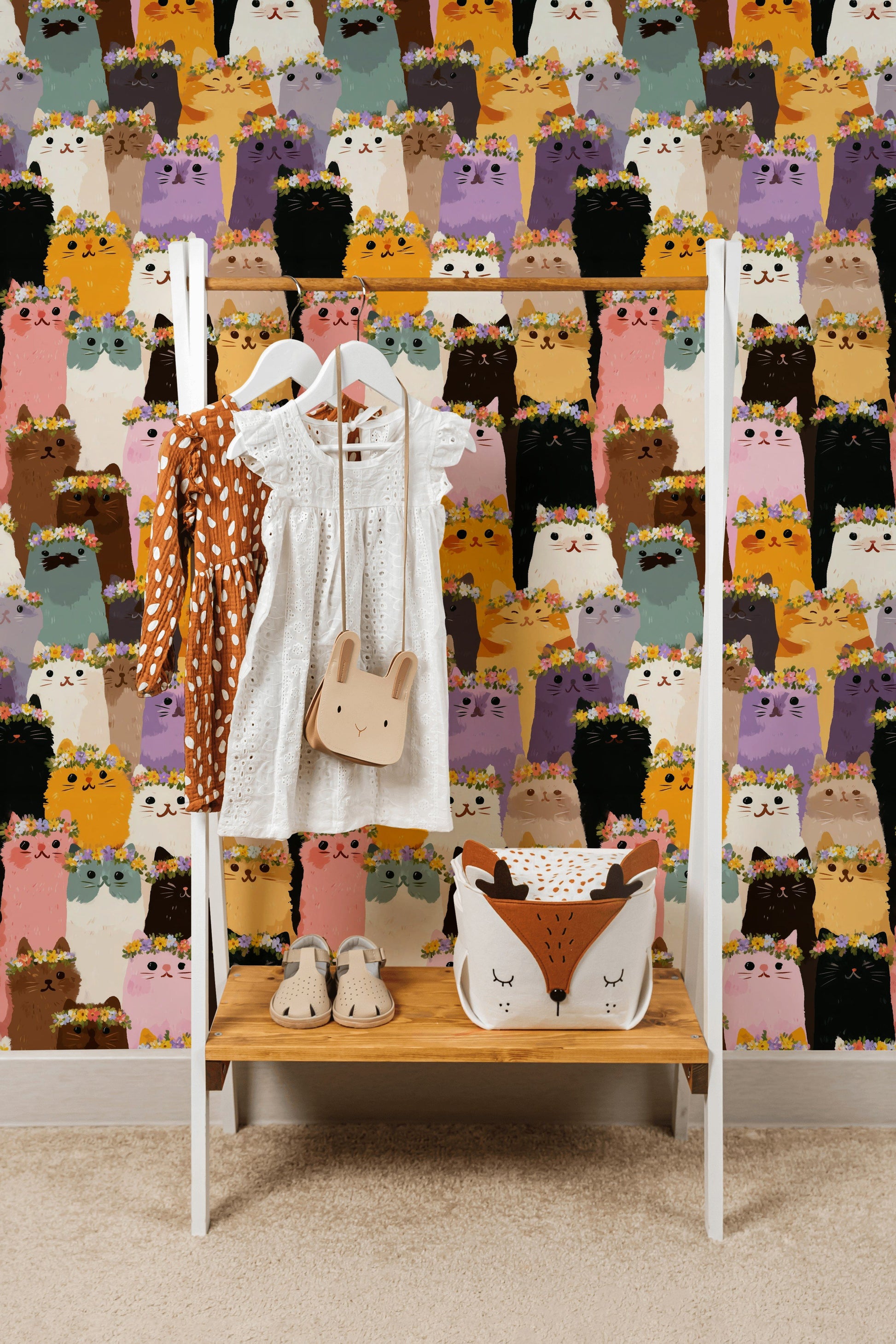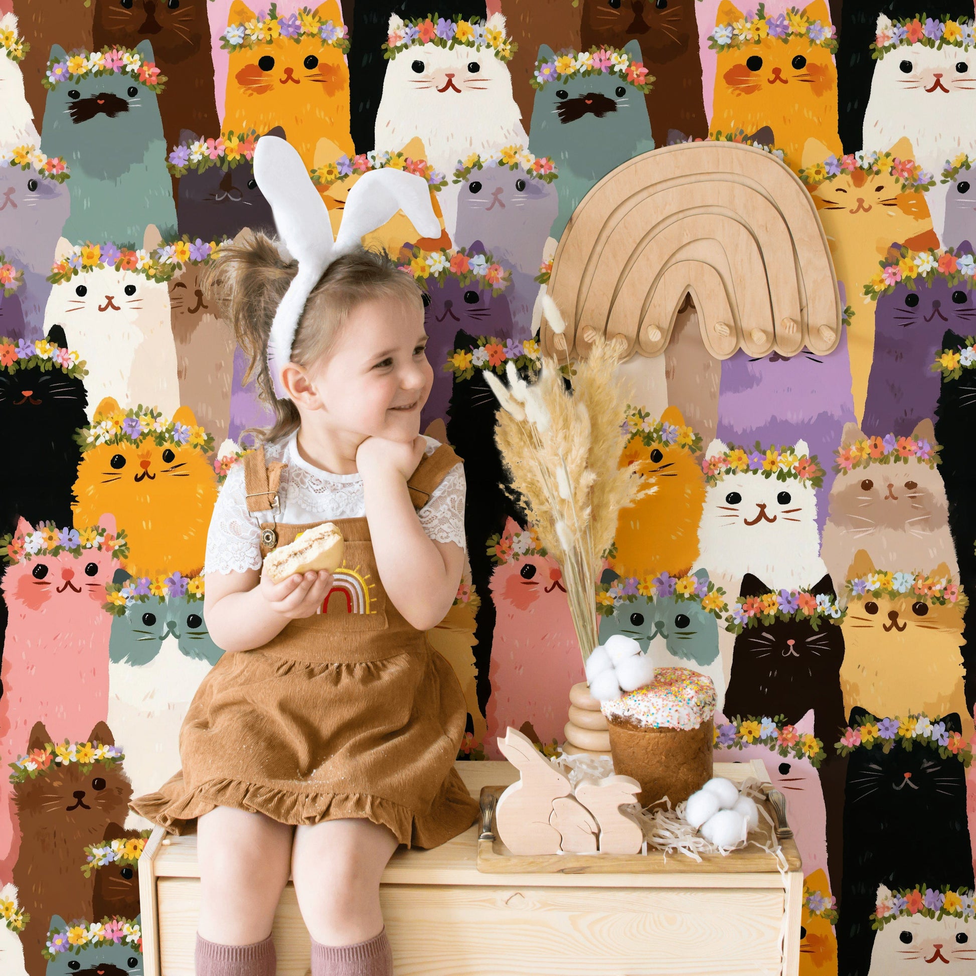 This decorative mural features cartoon cats in a range of pastel and earthy shades, each topped with a bright floral crown for a cheerful look. Designed as a peel and stick wallpaper, it’s an easy way to add playful decor to kids' rooms or nurseries. The cat wallpaper pattern includes fun kitten wall accents and a lively animal mural feel, mixing pastel decor and colorful cats for a happy, vibrant setting. Suitable for playful rooms, this mural combines floral and animal print details in a design that appeals to all ages.