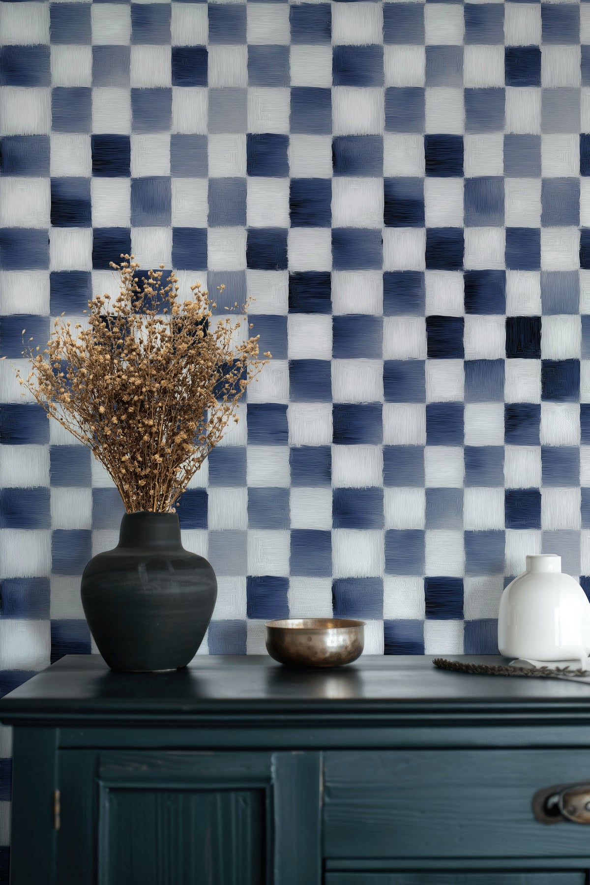Navy blue and white squares form a dynamic checkered pattern across this geometric wallpaper. The hand-painted brushstroke texture adds a unique tactile quality, ensuring this design stands out in any room.