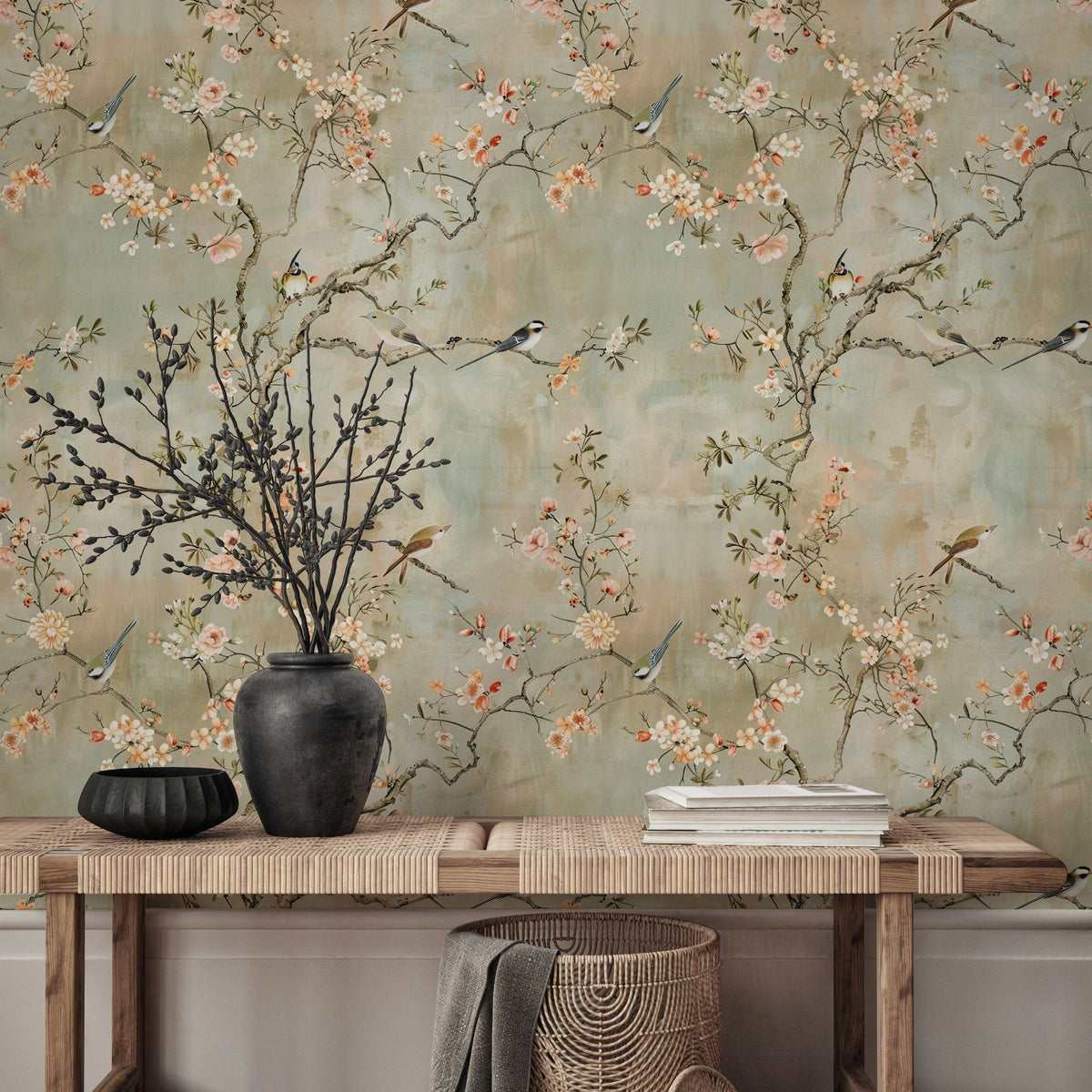 Delicate cherry blossoms and graceful birds are beautifully depicted against a soft beige background, creating a serene and elegant atmosphere. The balanced floral and avian motifs offer a subtle yet enchanting design, perfect for rustic or bohemian interiors.