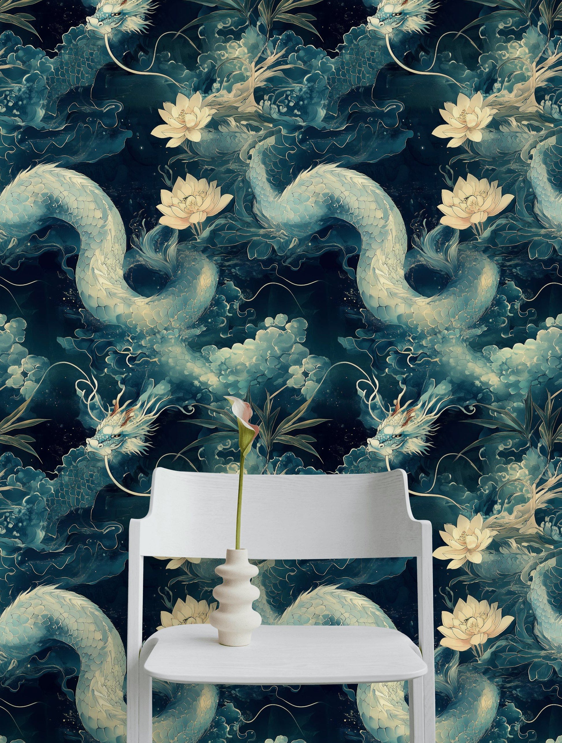 Chinese Dragon & Lotus Wallpaper Mystical Asian Wall Mural