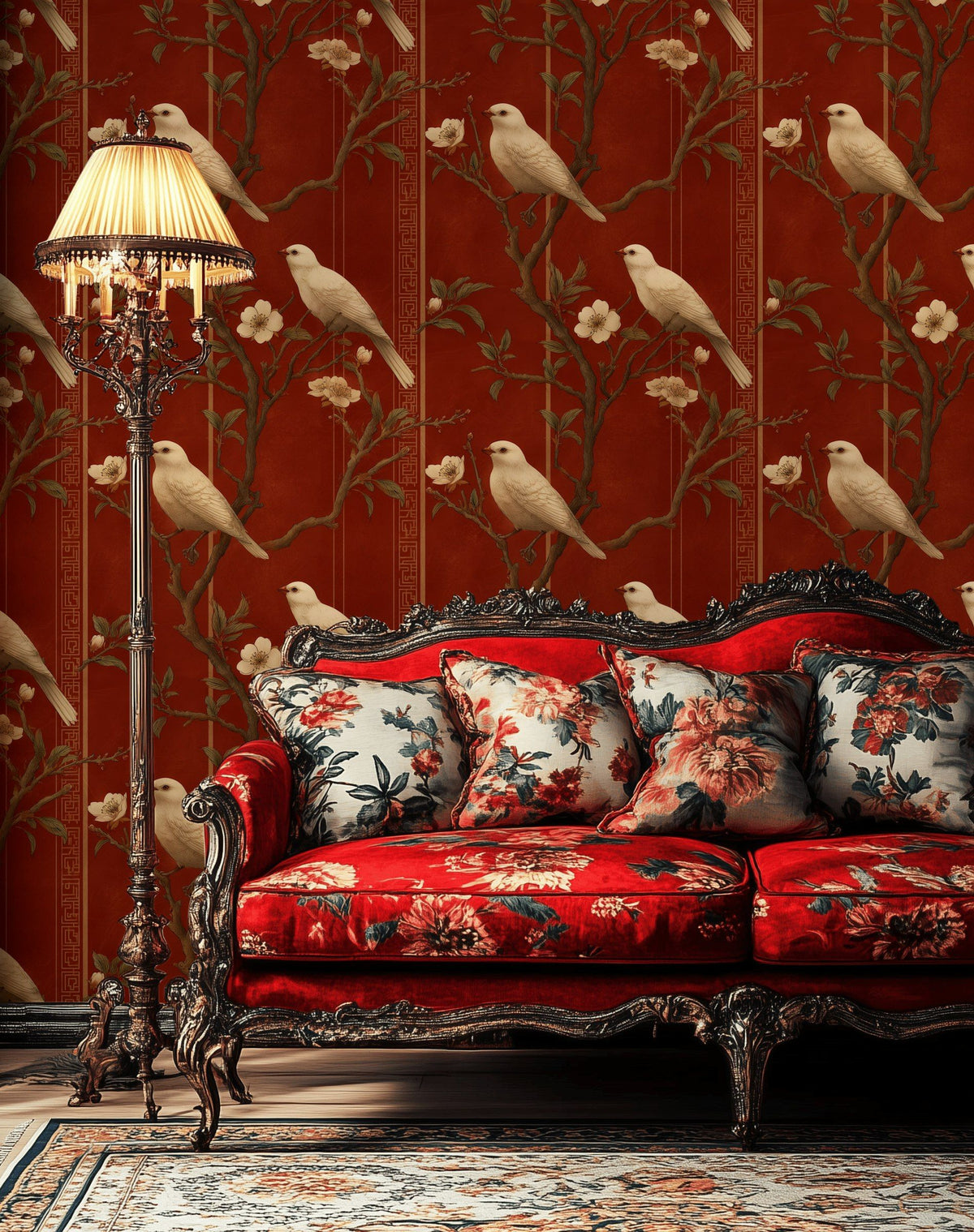 The unique combination of vintage floral motifs and elegantly perched birds on a rich mahogany background sets this wallpaper apart. Its medium-scale pattern and luxurious color palette create an intimate atmosphere, making it a standout choice for sophisticated, opulent interiors.