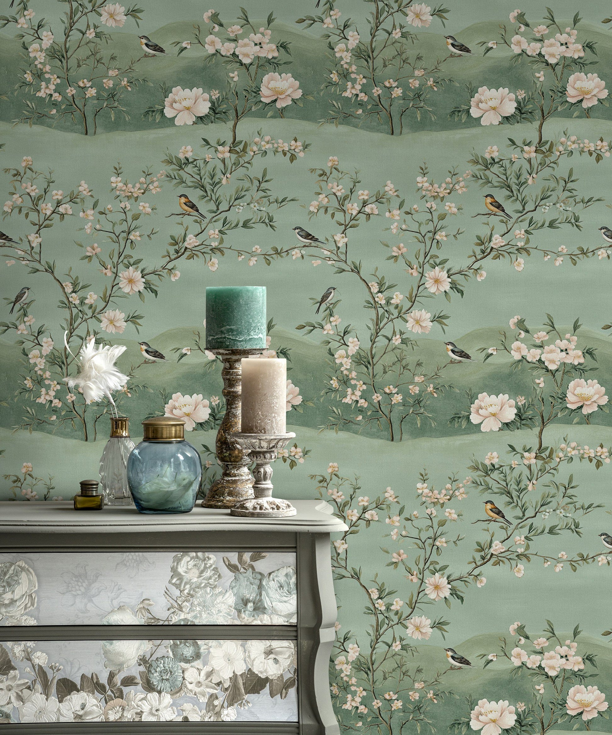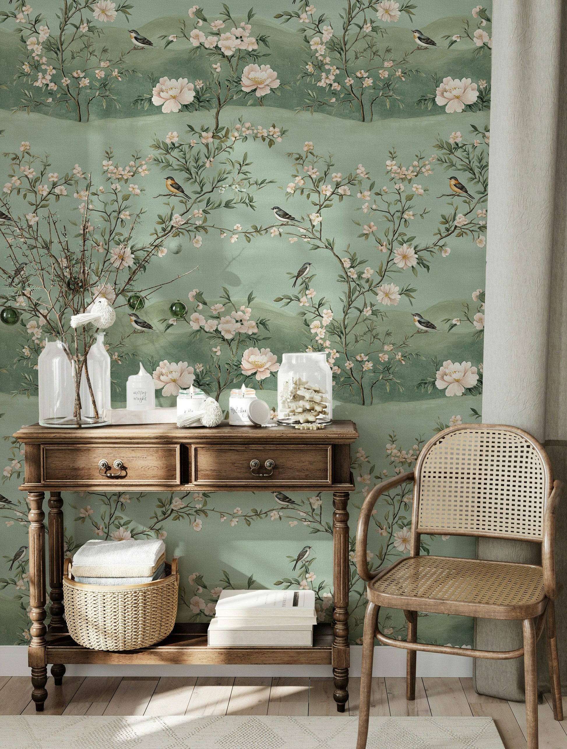 Chinoiserie Style Floral Wallpaper Serene Green Bird and Blossom Wall Mural