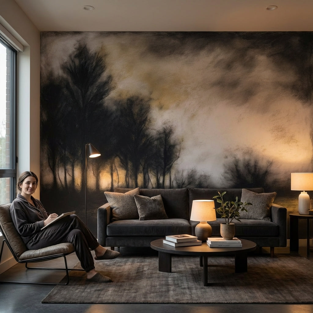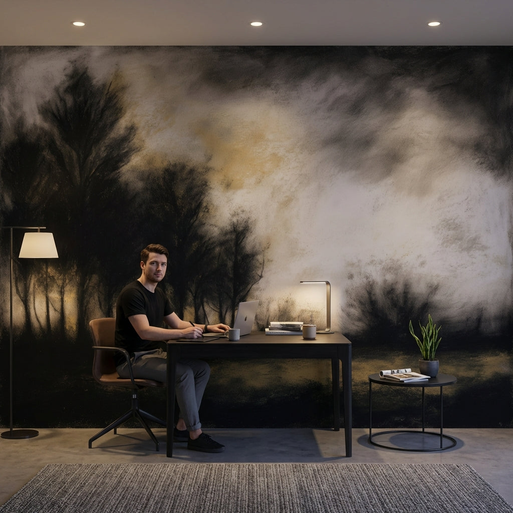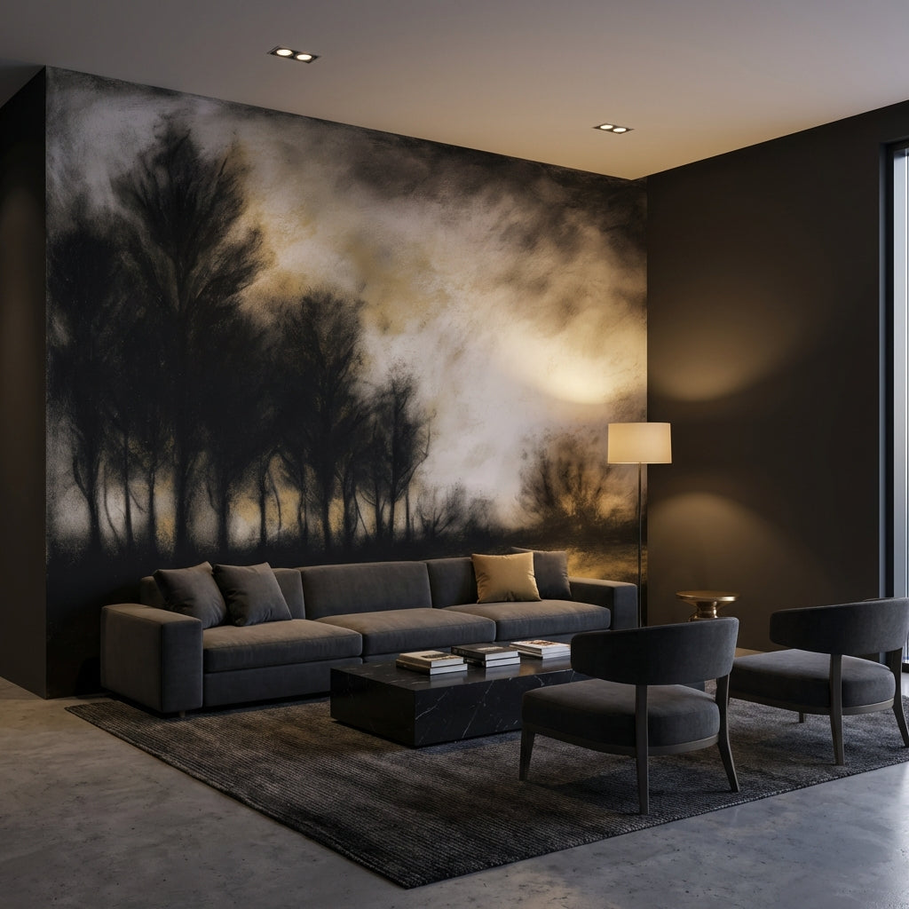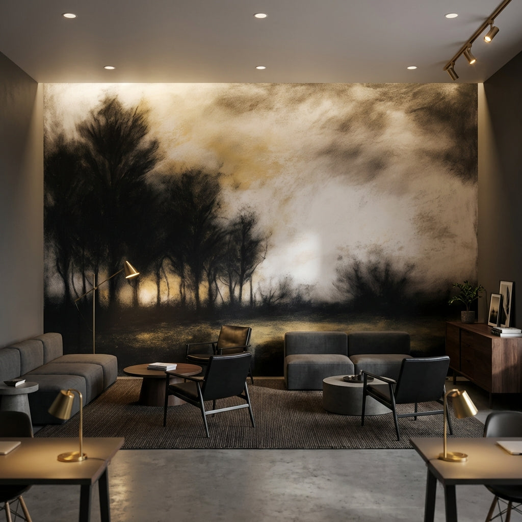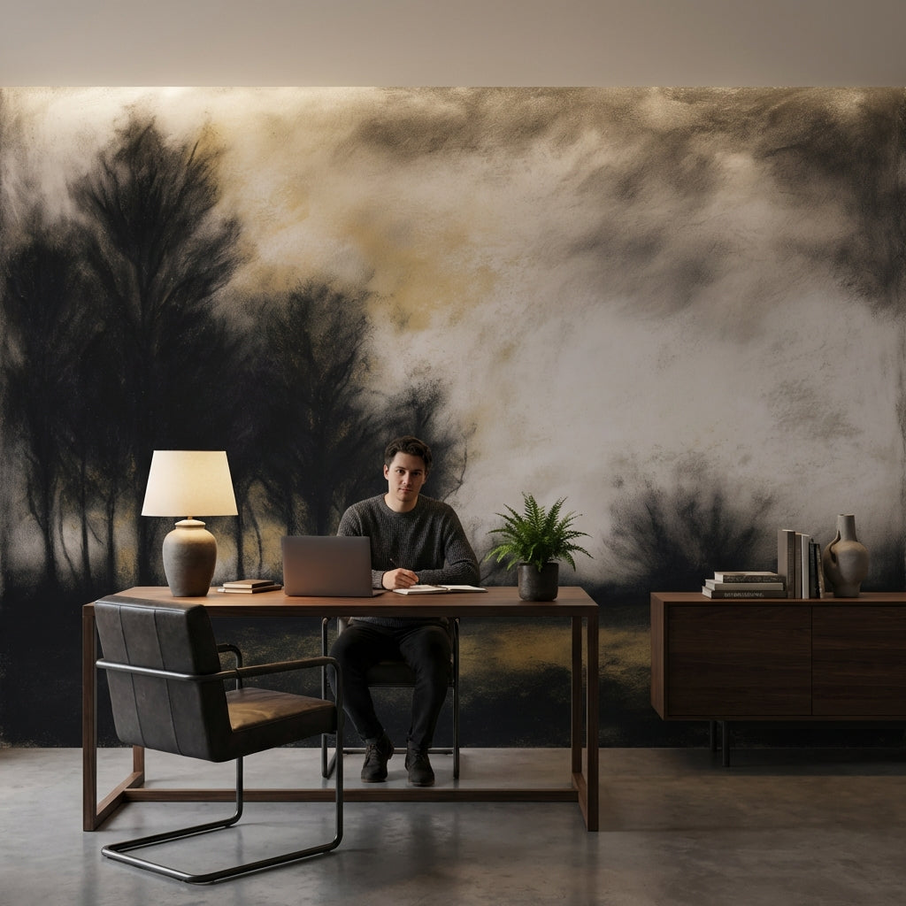 This abstract mural shows trees against a cloudy sky, using black, brown, and beige tones. The design works beautifully as nature-inspired decor.