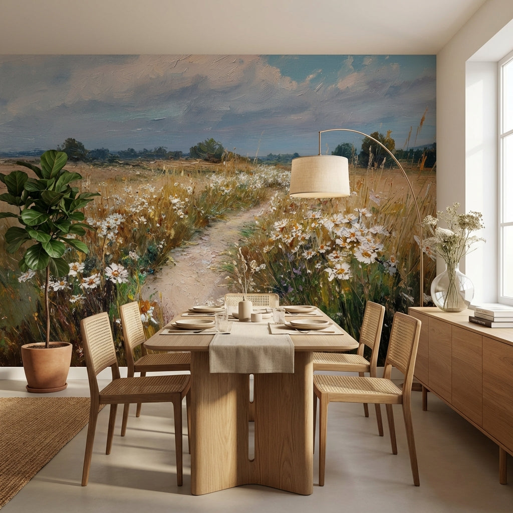 This landscape mural shows a serene nature path flanked by lush trees and flowers under a cloudy sky. The blue and green hues offer a peaceful scene for any room.