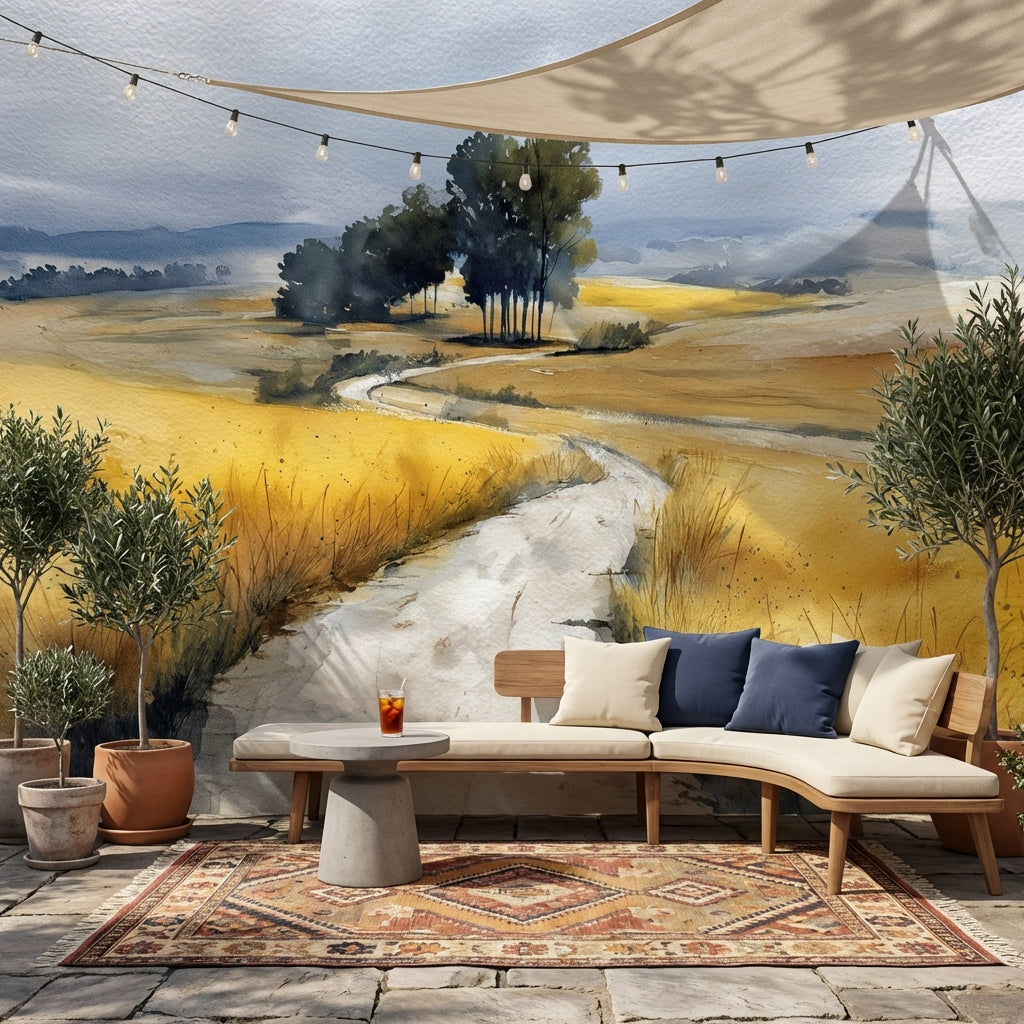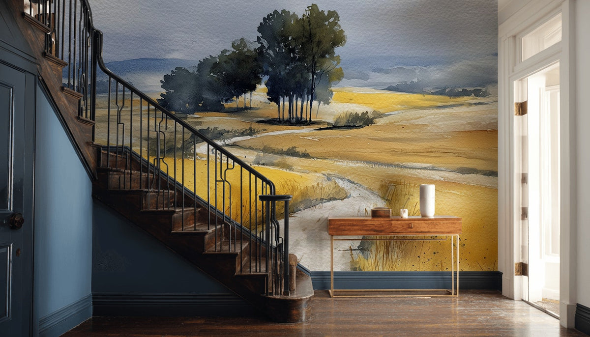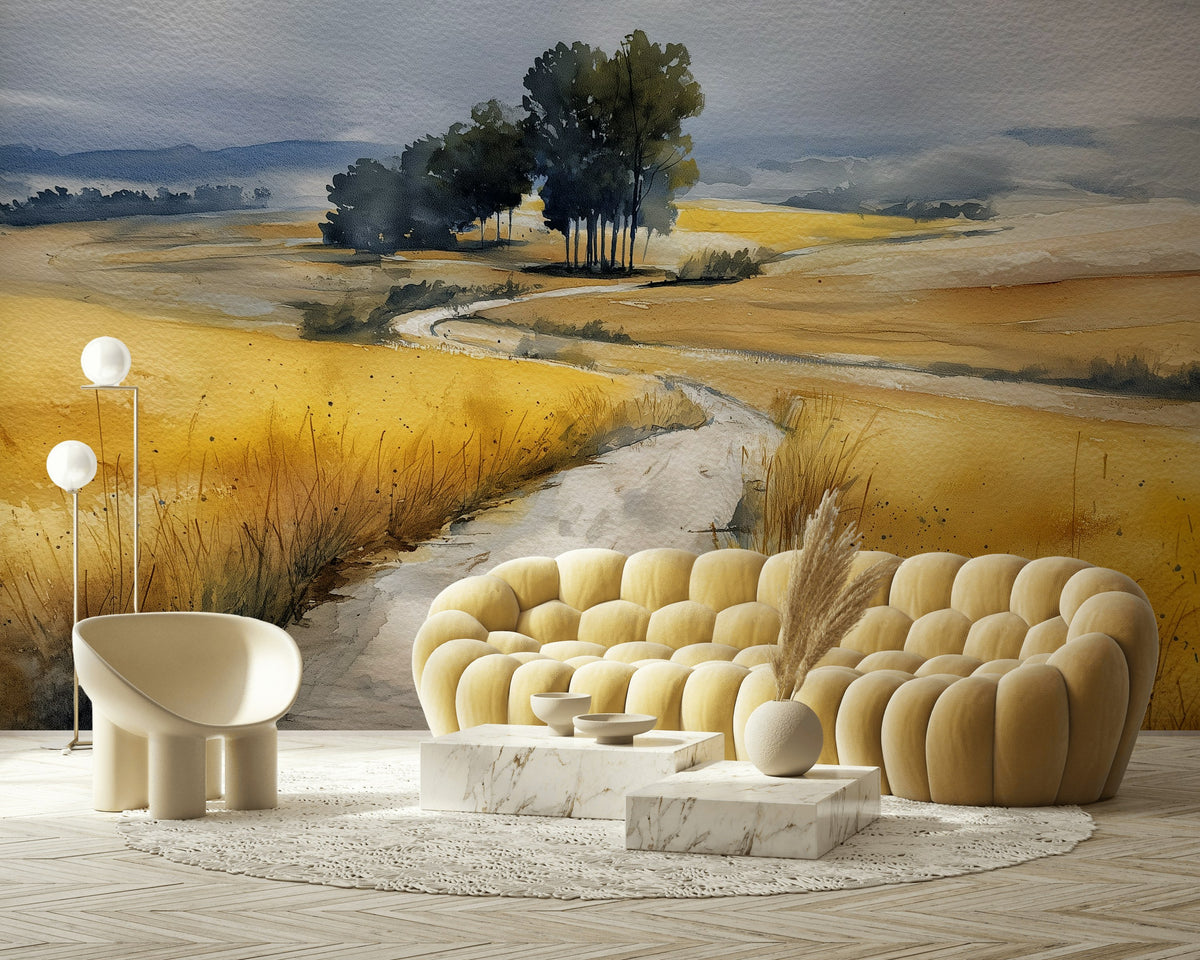 This watercolor mural shows a serene landscape with trees and a grassy path under a cloudy sky. The soft yellow and green tones create a calming ambiance, perfect for nature-inspired decor.