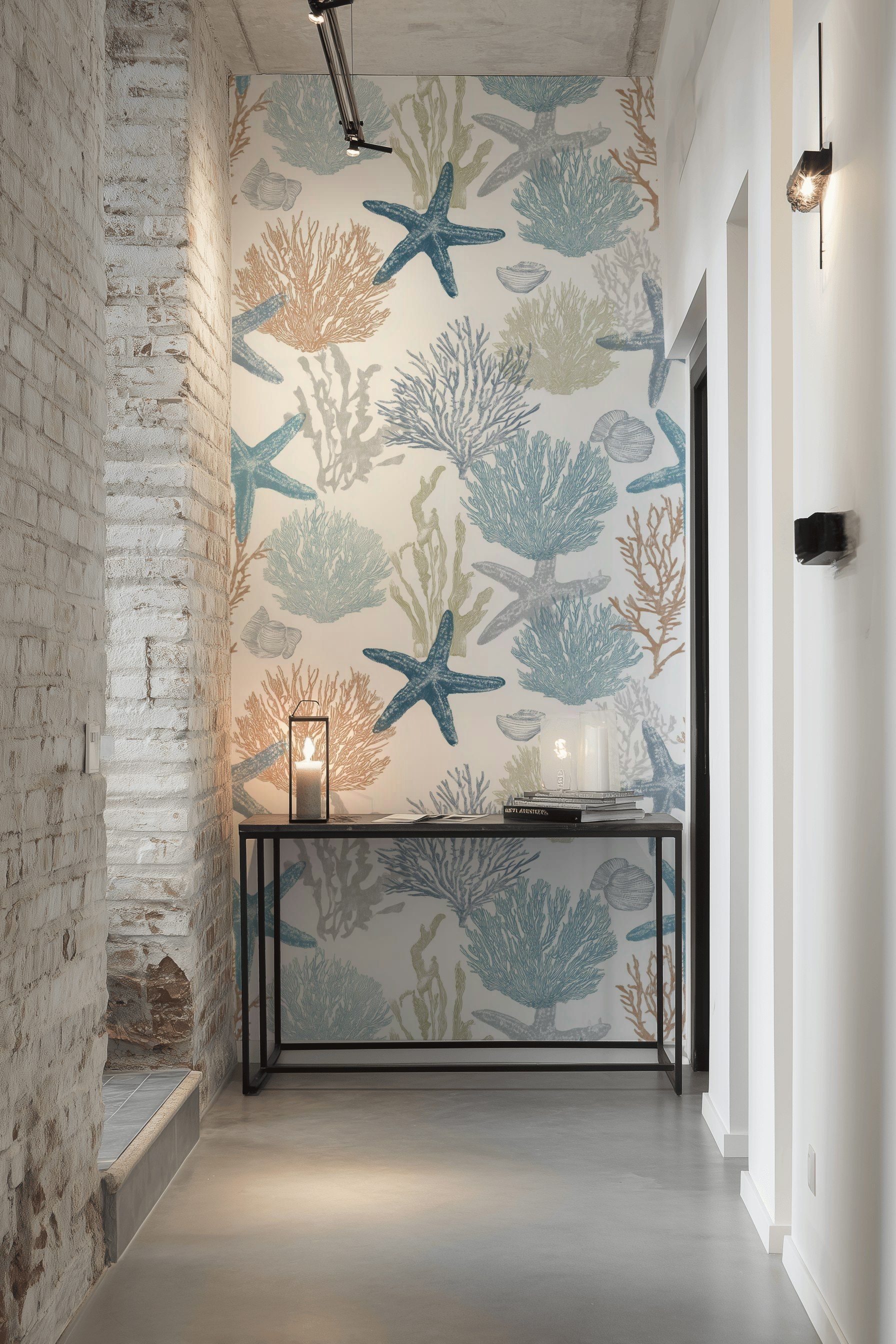 Featuring detailed coral and starfish motifs, this coastal wallpaper is printed in soft blue and tan hues over a clean white base. The marine pattern includes seashells and underwater textures that bring a relaxed ocean-inspired character to interiors. Designed for light, airy rooms, this nautical wall mural adds subtle texture and natural seaside charm.