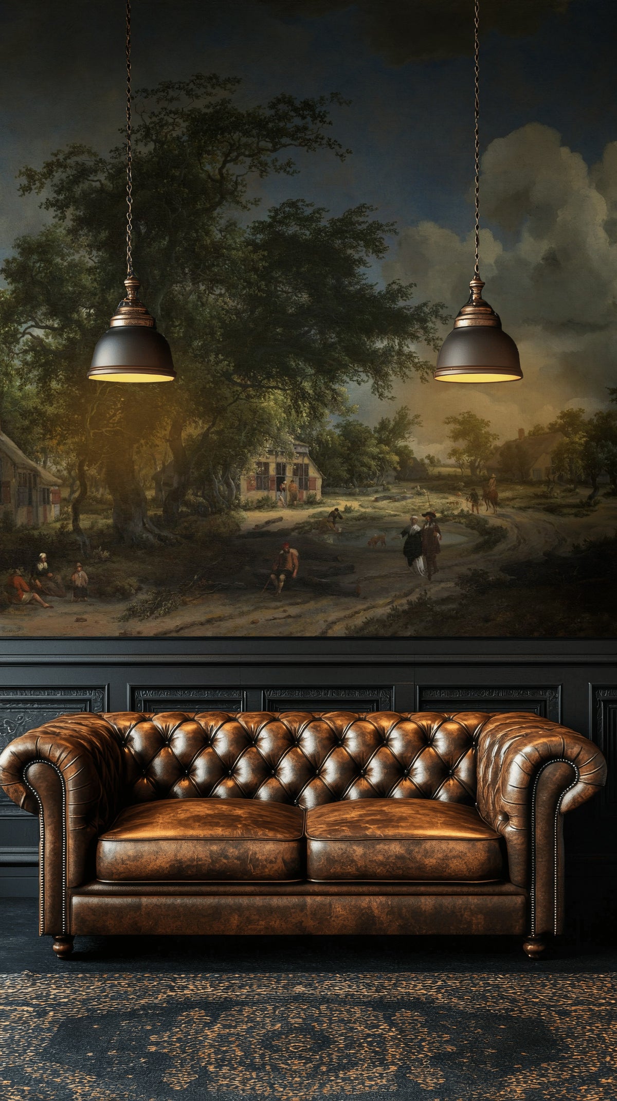 How does the design of the Dark Vintage Countryside Landscape Wall Mural complement rustic interior styles?