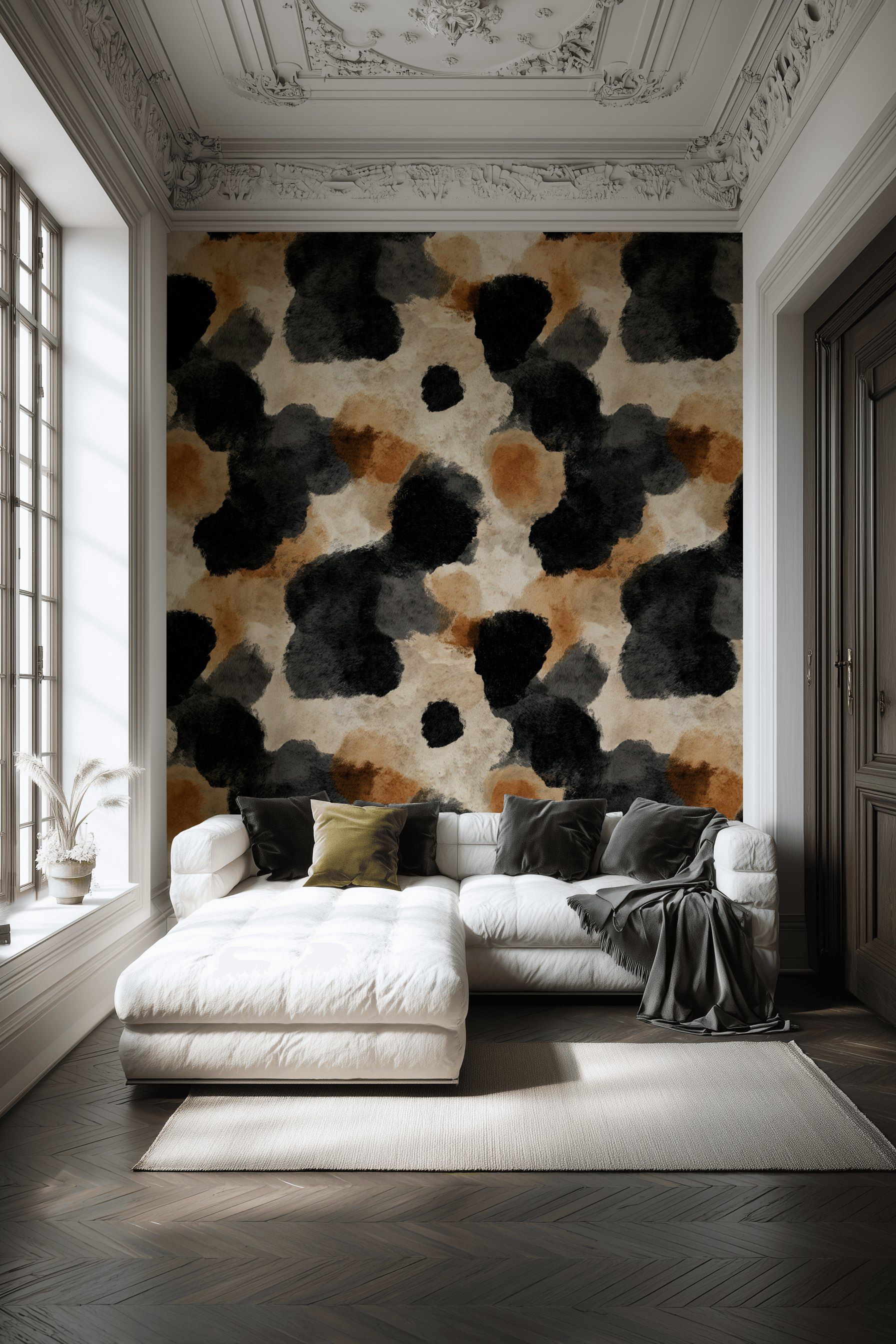 This cow print wallpaper features an animal hide pattern in black, brown, beige, and cream with a soft textured appearance. Designed with irregular organic patches, it gives a natural feel to rustic, farmhouse, or modern eclectic interiors. The mural works well for creating a bold statement wall, pairing seamlessly with western decor, boho accents, or modern rustic spaces. Its animal print character adds versatility, making it a standout design for all ages.