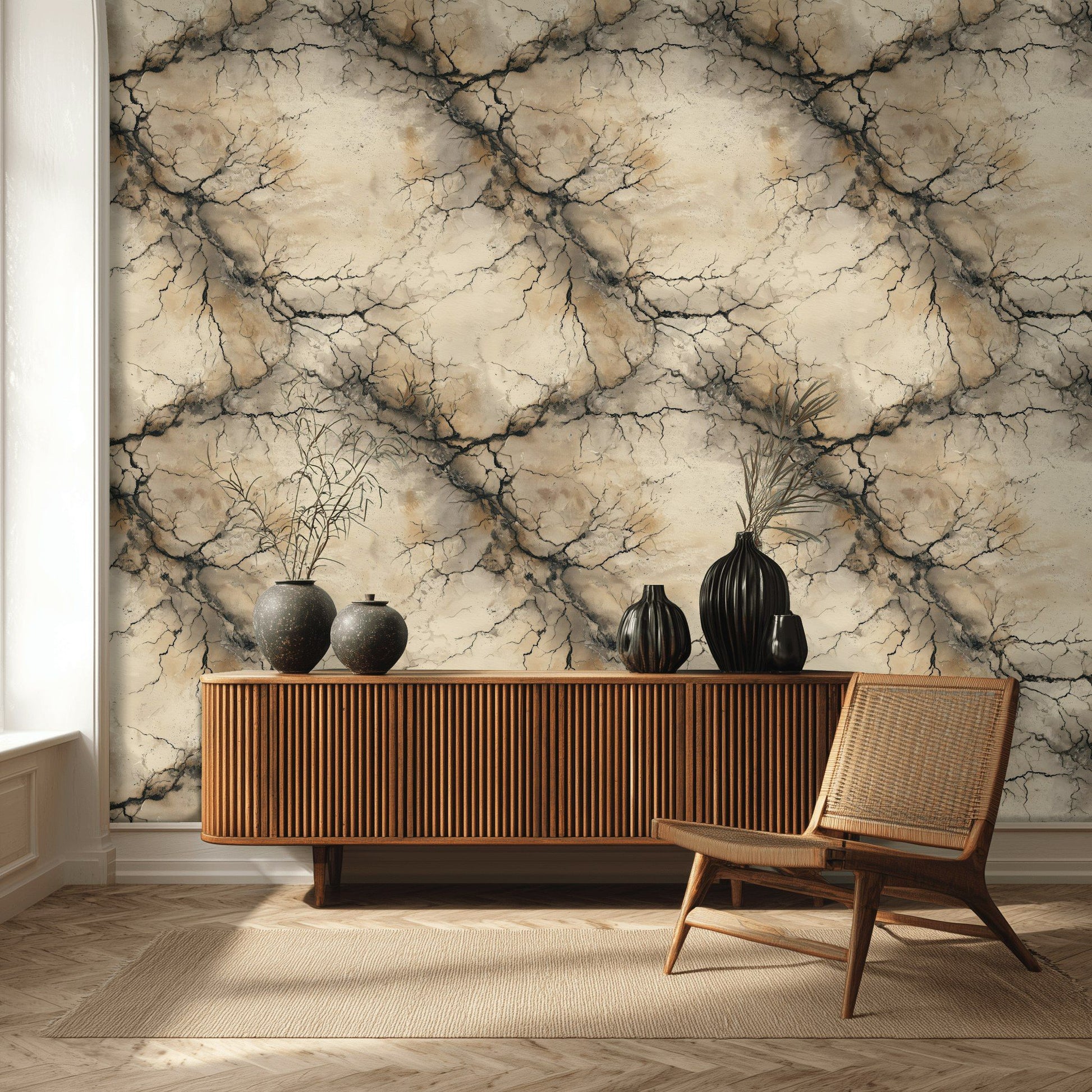 This cracked stone wallpaper mural features fractured wall details in beige, tan, gray, and black, giving a distressed industrial surface feel. The abstract pattern resembles raw stone textures with deep cracks and natural weathering. Designed for modern rustic and industrial interiors, it works well as a fractured wall accent or textured mural backdrop. The muted neutral tones and raw surface detail create a bold yet versatile wall decor statement.