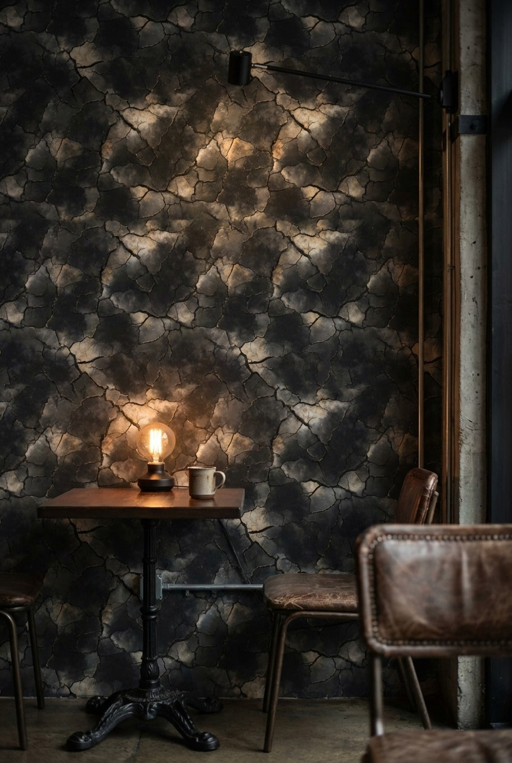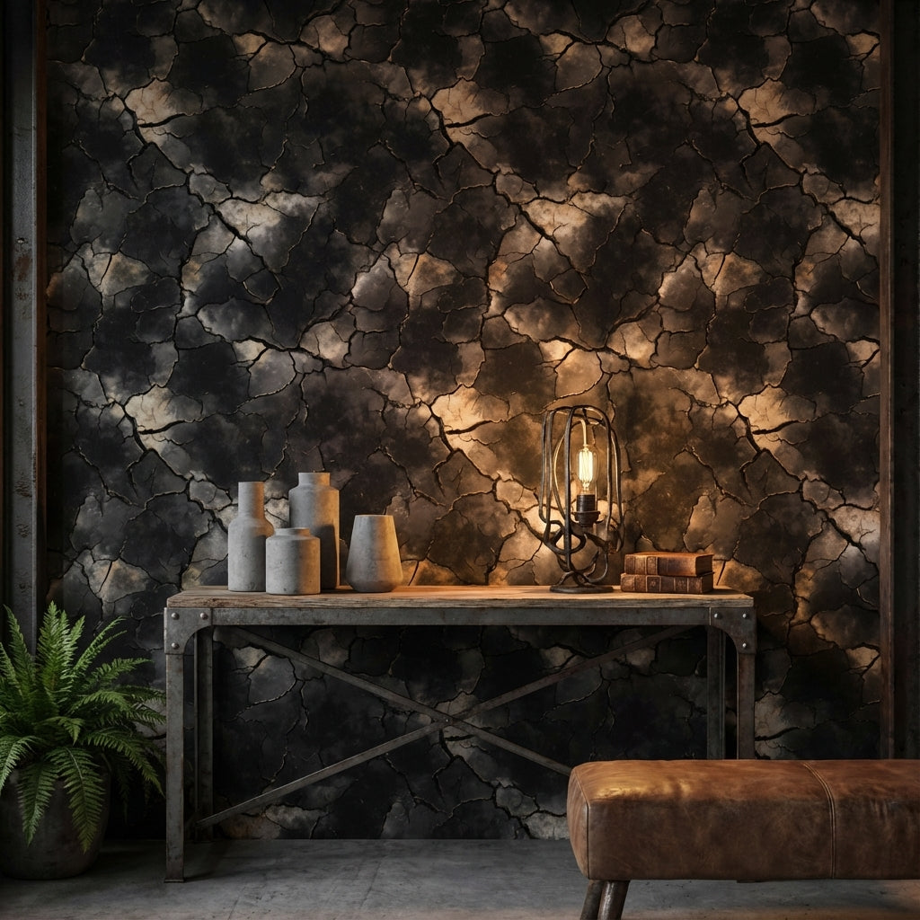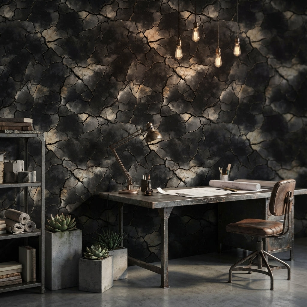 The charcoal crackle effect of this wallpaper enhances industrial interiors by mimicking a natural stone texture with its dark tones and large-scale pattern. It adds depth and a raw, edgy vibe that complements the rugged elements typical of industrial design.