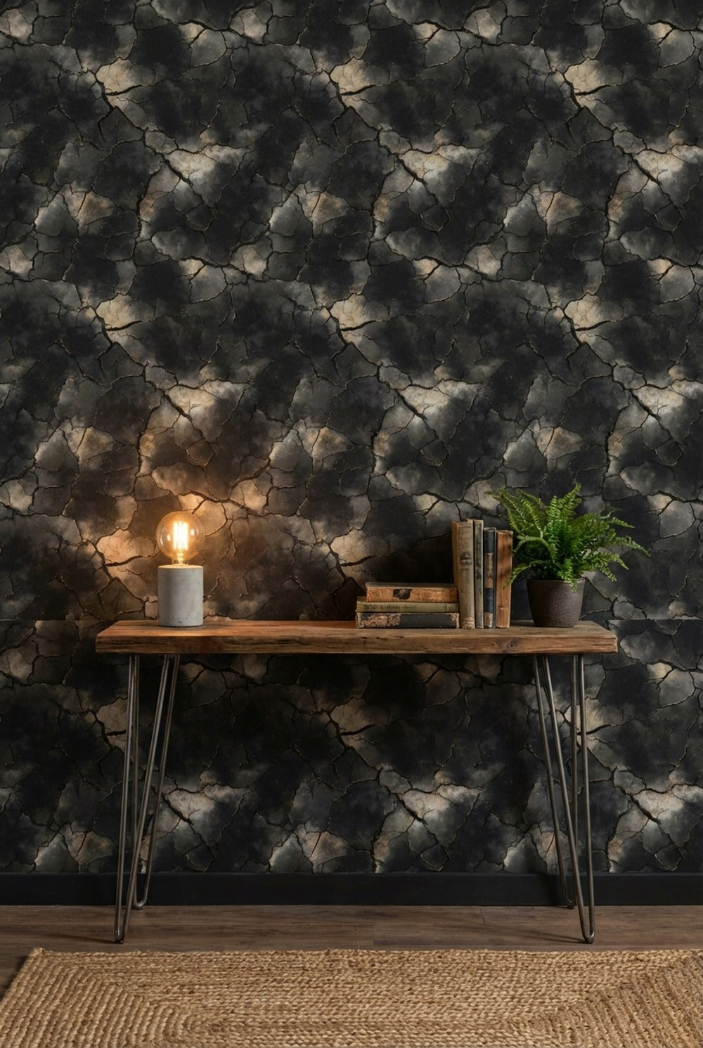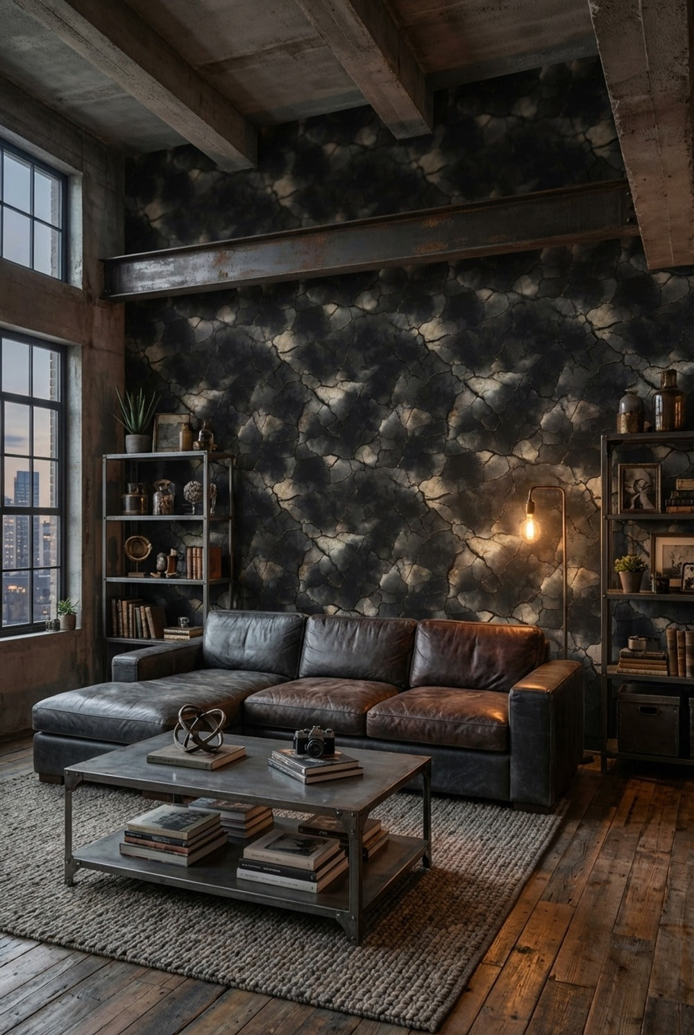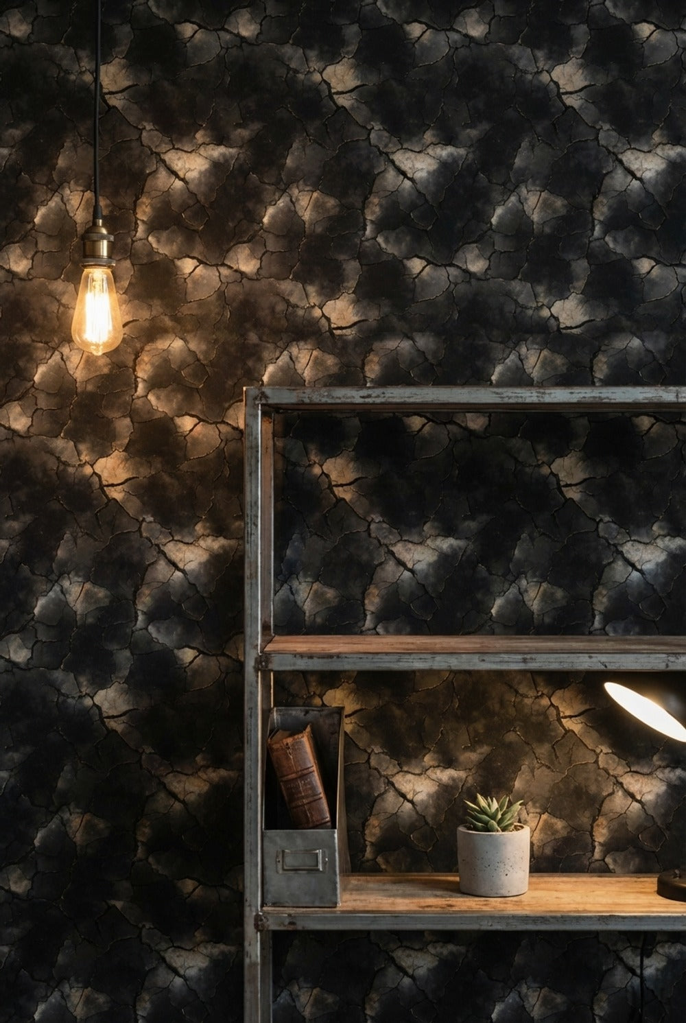 The charcoal crackle effect of this wallpaper enhances industrial interiors by mimicking a natural stone texture with its dark tones and large-scale pattern. It adds depth and a raw, edgy vibe that complements the rugged elements typical of industrial design.