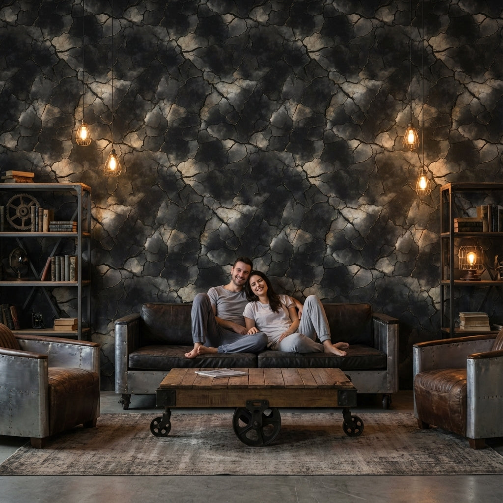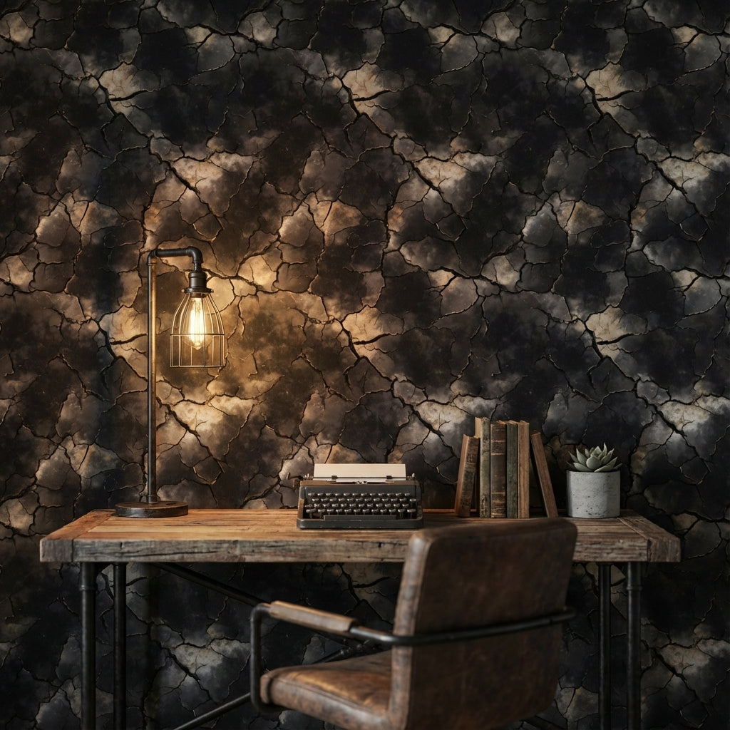 Charcoal and gray tones entwine in a dramatic crackle effect across the wallpaper's surface, creating a bold abstract design reminiscent of a natural stone texture. The intricate pattern breaks away from conventional smooth finishes, adding a modern artistic flair to any interior. Perfectly suited for industrial and modern interiors, this wallpaper acts as a striking backdrop for living room feature walls or the focal accent in sophisticated home offices. The unique pattern adds depth and texture, absorbing light to create an intimate and moody atmosphere. Complement this bold design with industrial-style furnishings, such as metal fixtures, leather accents, and sleek, minimalist décor to enhance its contemporary appeal.