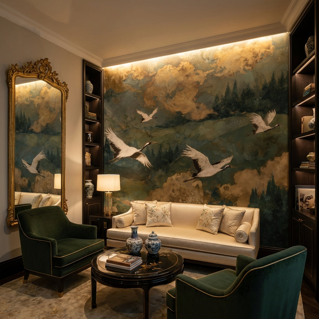 This vintage-style mural shows flying cranes over a serene mountain landscape with cloud formations. The green and blue tones give it an artistic feel, ideal for a nature-inspired decor.