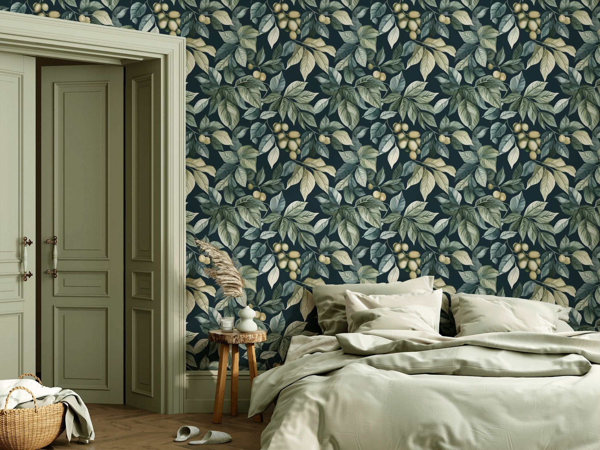 Wrap your walls in the sophisticated tranquility of a moonlit garden with our stunning dark botanical wallpaper. This elegant design features gracefully cascading leaves and delicate olive-like berries, all rendered in a beautiful watercolor style. The serene palette of sage green, dusty teal, and soft grey foliage creates a beautiful contrast against the deep, dark navy blue background, lending a moody and immersive quality to any room. This wallpaper is perfect for creating a dramatic and intimate accent wall in a bedroom, an elegant dining room, a cozy living room nook, or a chic powder room.