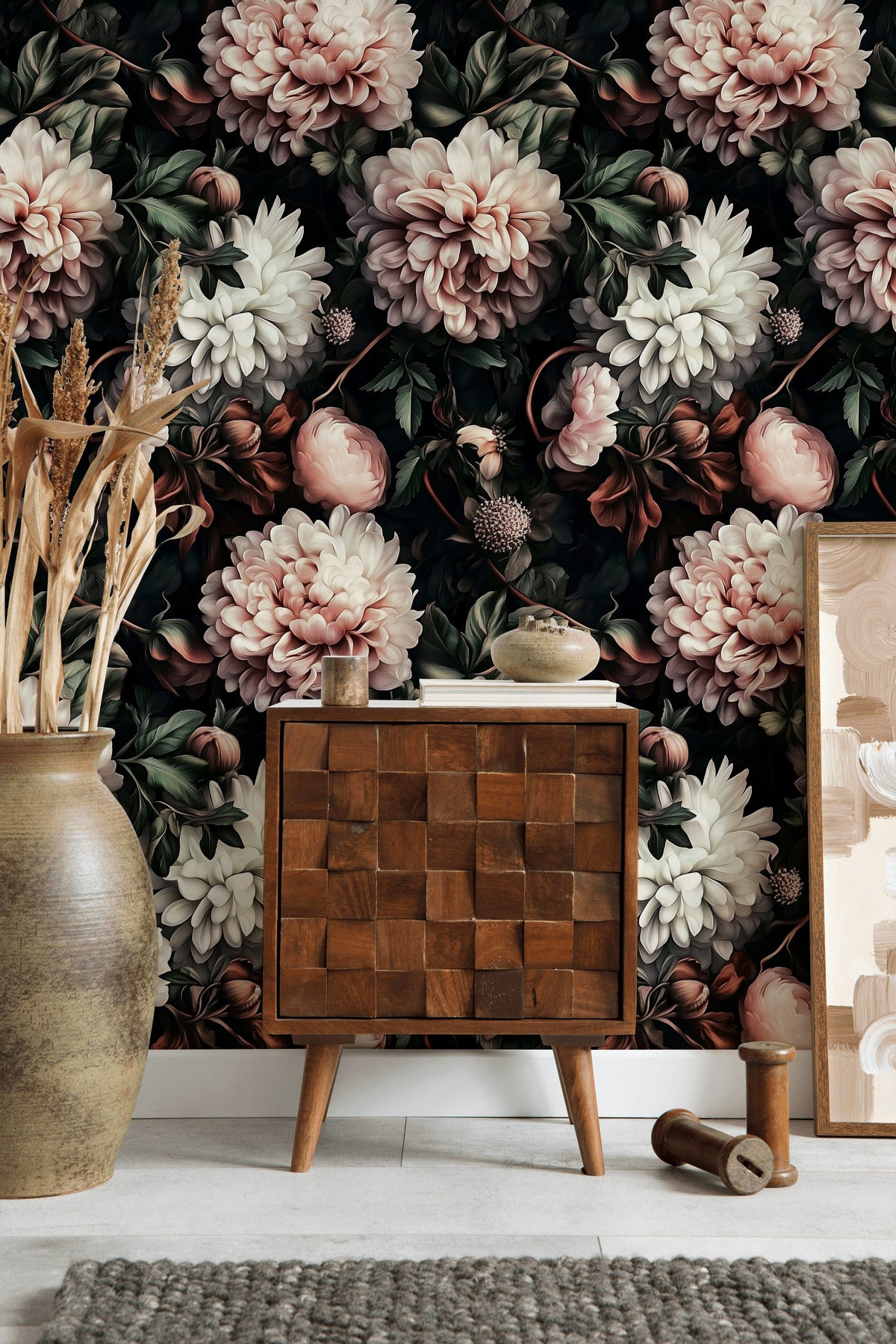 How does the Moody Black Background with Lush Pink Floral Wallpaper complement luxury or modern interior styles?