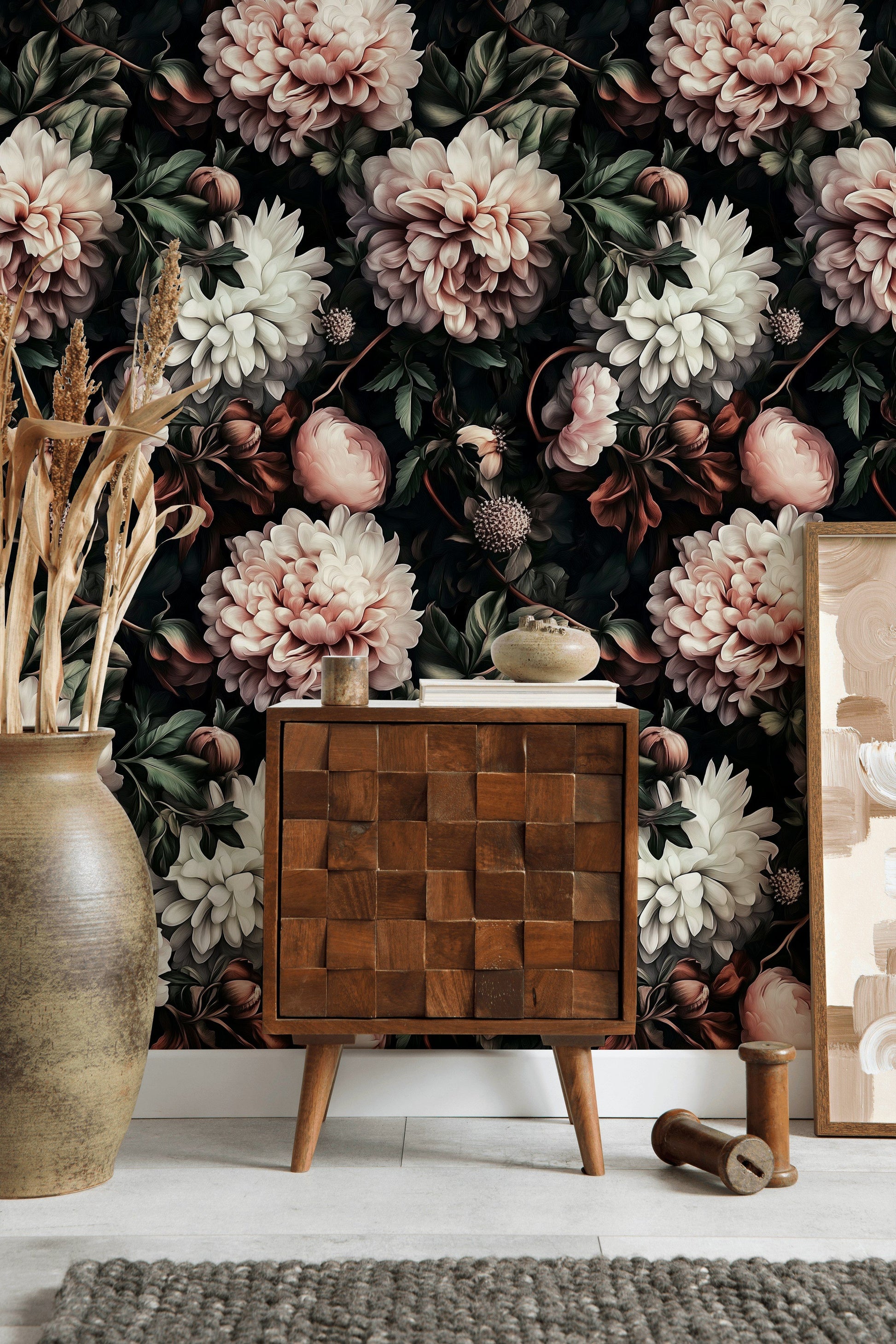 Dark Dahlia and Peony Wallpaper Luxurious Vintage