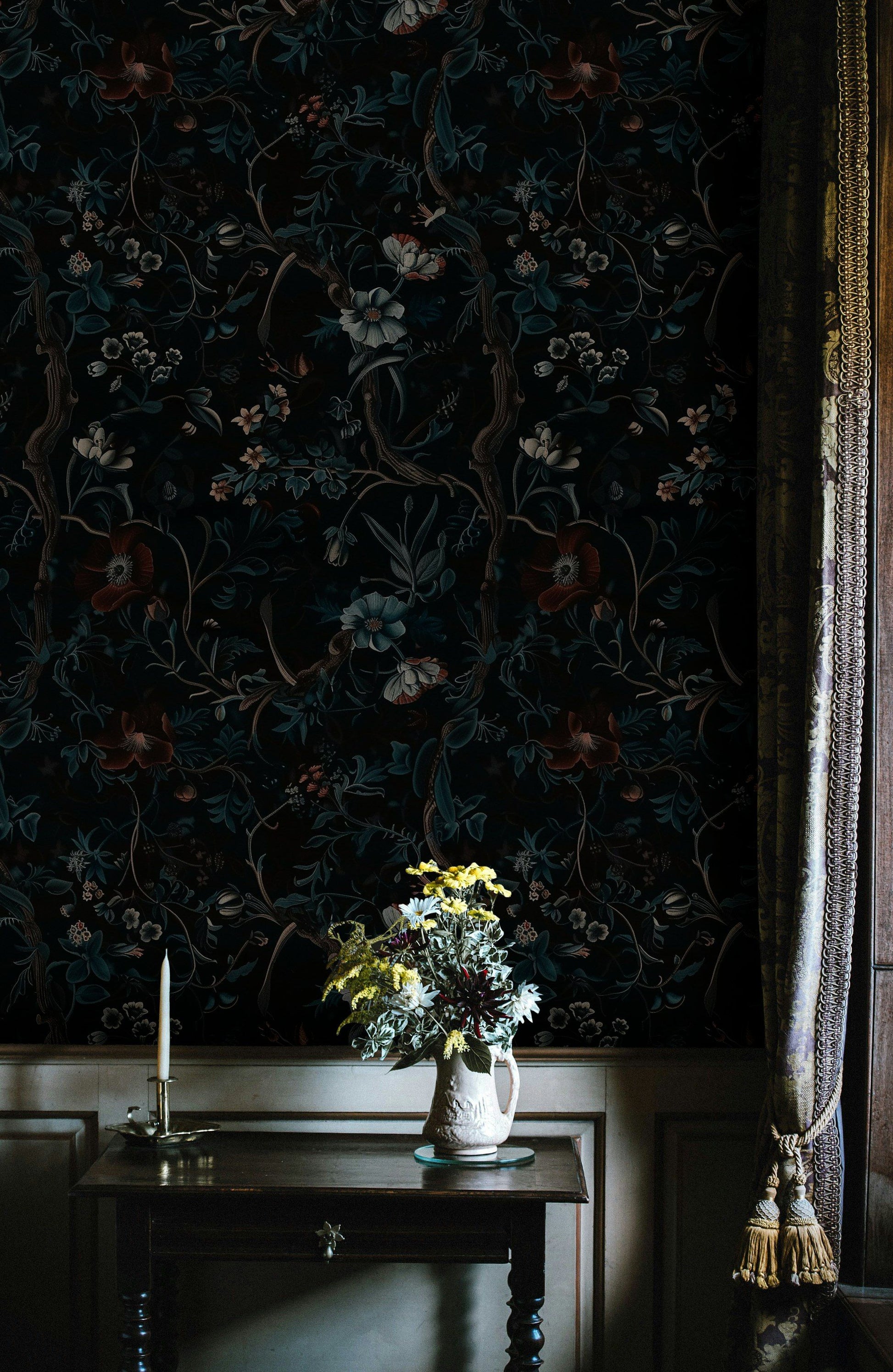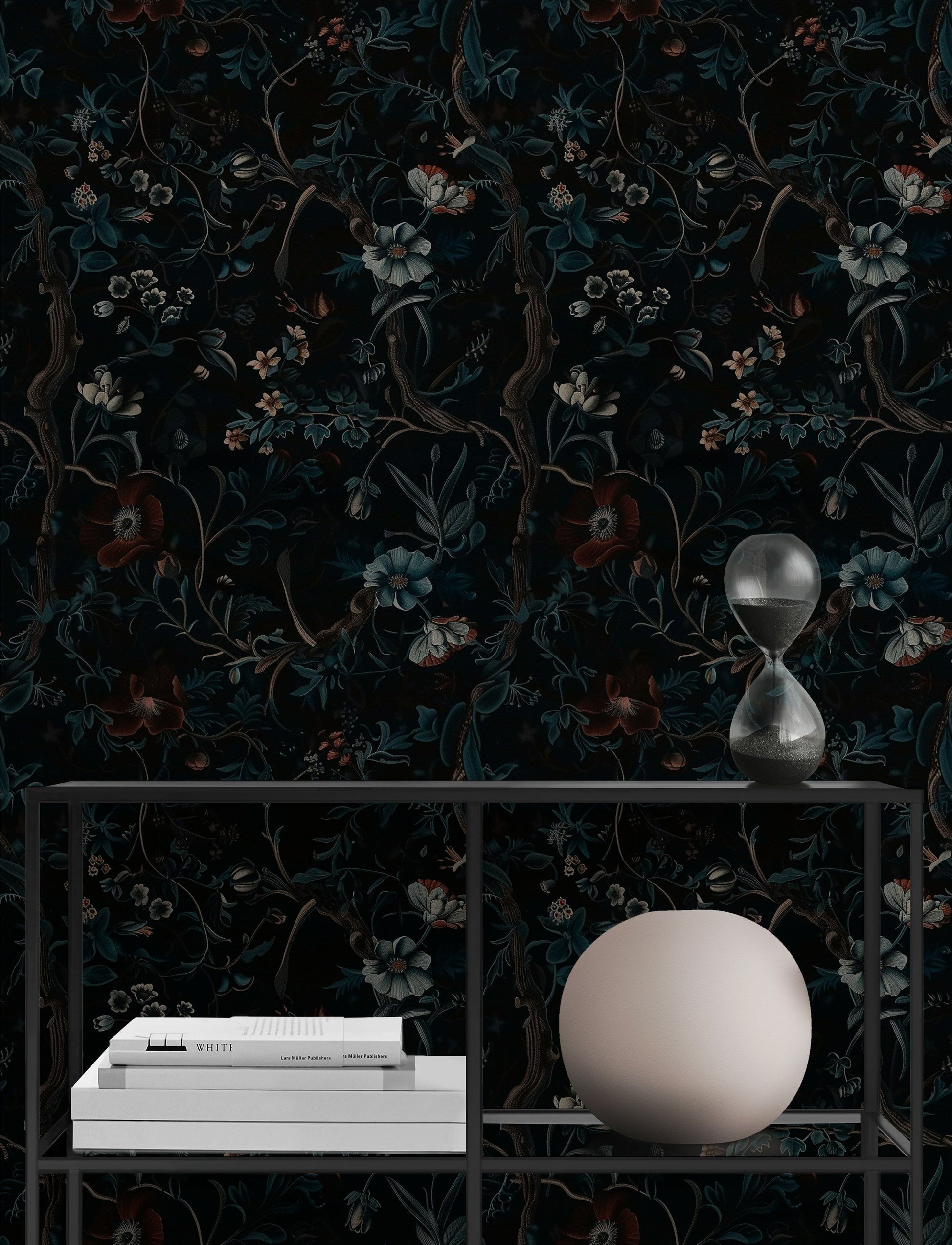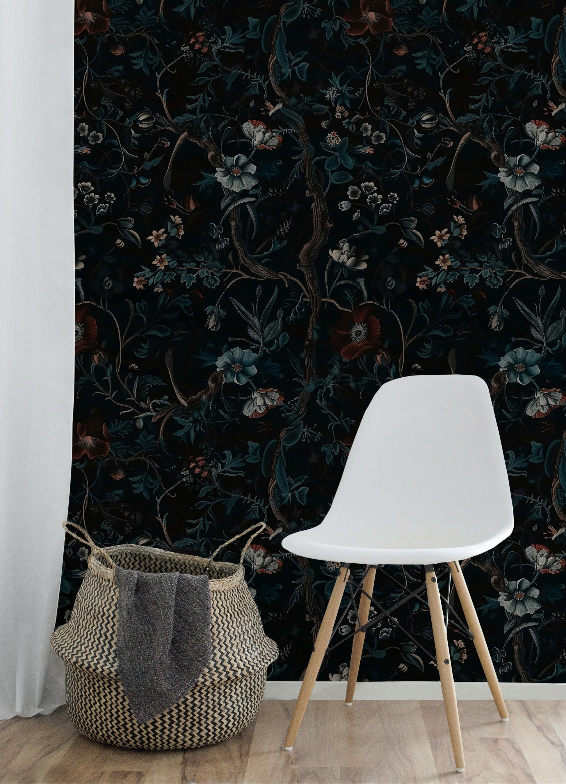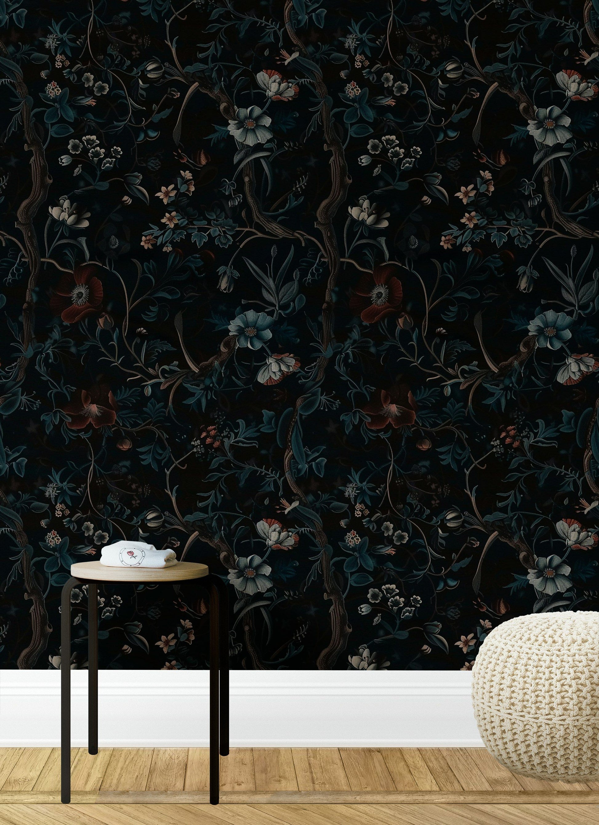 Enhance your home decor with this exquisite dark floral botanical wallpaper. Featuring intricately detailed flowers and foliage against a deep black background, this wallpaper brings a sense of elegance and sophistication to any room. The rich, dark tones and delicate botanical design create a dramatic and captivating look, perfect for making a bold statement.Ideal for living rooms, bedrooms, or any space that seeks a blend of vintage charm and modern sophistication. This wallpaper is perfect for creating a feature wall that stands out with its timeless beauty and artistic flair.