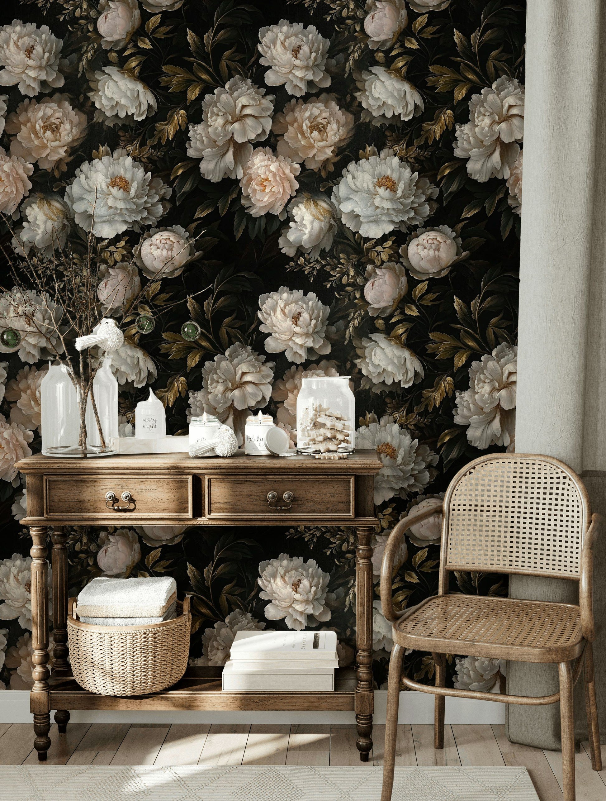 Transform your space with our dramatic and elegant Dark Floral Wallpaper! This stunning wall mural features a luxurious arrangement of ivory and cream peonies against a deep, moody background. Perfect for creating a sophisticated and romantic atmosphere in your living room, bedroom, or dining area. Crafted with high-quality, durable materials, our wallpaper is designed for long-lasting beauty and easy installation. Choose between traditional pre-pasted wallpaper for a lasting installation or removable peel-and-stick vinyl for temporary decorating! Enjoy a seamless and professional-looking finish with minimal effort. Elevate your interior design with this eye-catching and unique wall mural. Its rich, dark tones and exquisite floral details will add a touch of gothic glamour to your décor. Create a captivating and stylish space with our Dark Floral Wallpaper!