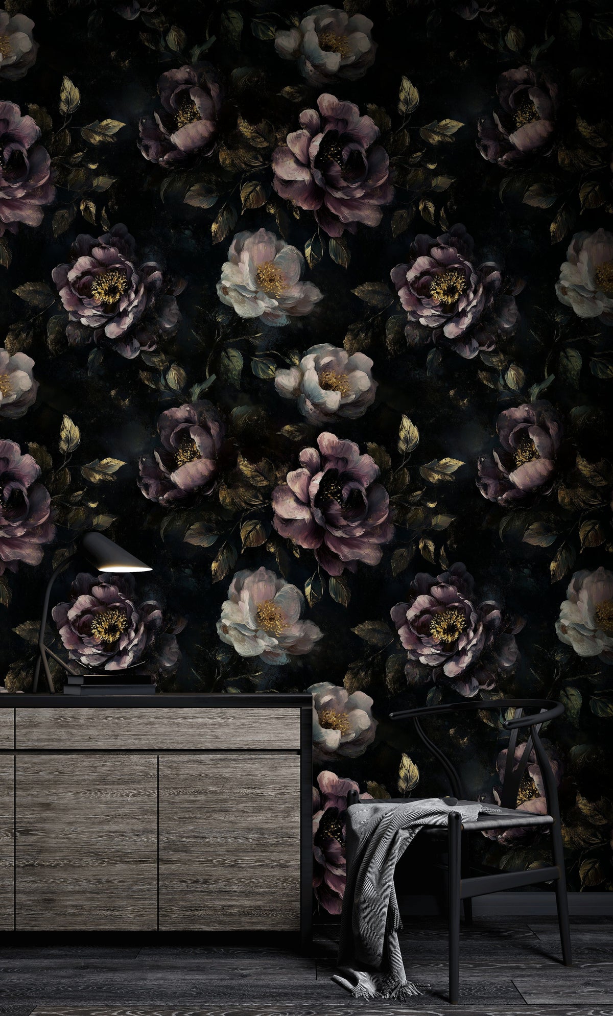 Rich plum and deep black tones create a dramatic floral design with large, lush blooms that evoke a sense of timeless elegance. The painterly texture of the petals gives a luxurious, antique feel, making it a standout choice for those seeking something unique and elegant.Perfect for creating a sophisticated feature wall in a luxury bedroom or a classic living room with high-end furnishings. This bold design acts as a stunning backdrop, enhancing the room's glamorous appeal.The dark tones create
