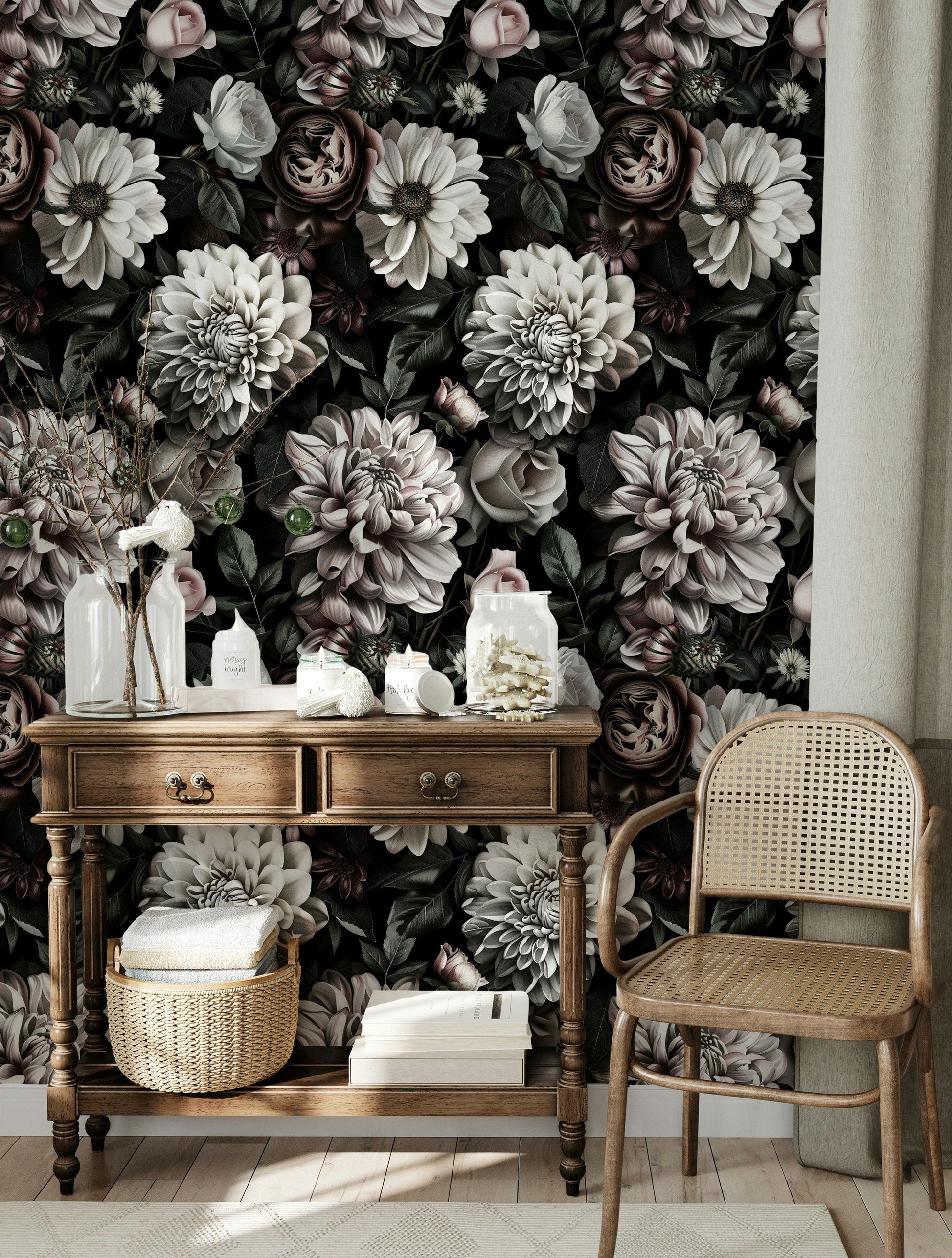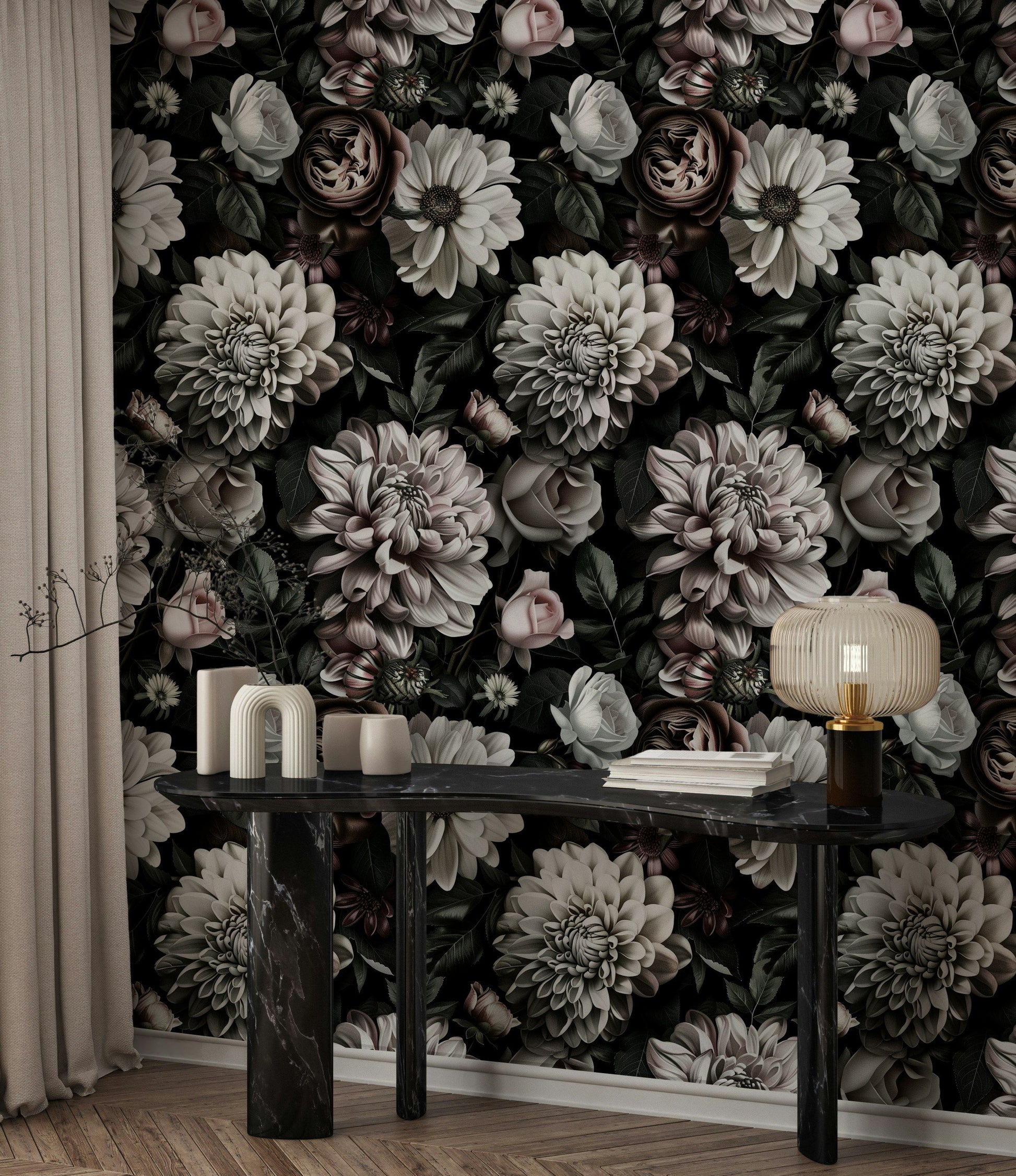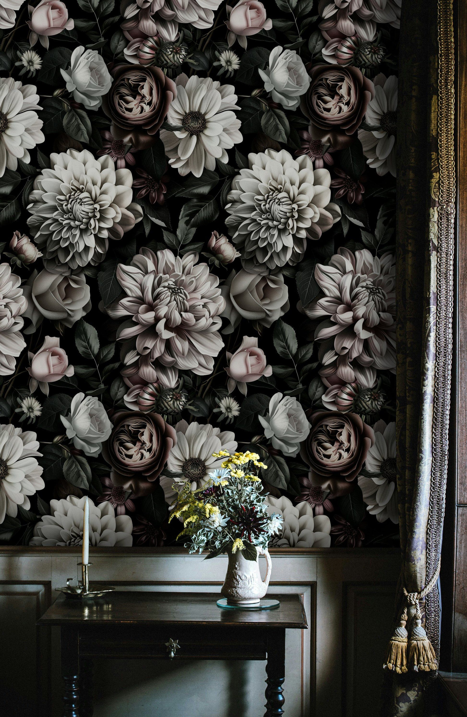 Transform your space with this stunning dark floral wallpaper. Featuring a lush arrangement of vintage-inspired blooms in muted tones against a dramatic black background. The large-scale flower print creates a moody, romantic atmosphere perfect for bedrooms, living rooms, or accent walls. High-quality print captures every petal's detail.