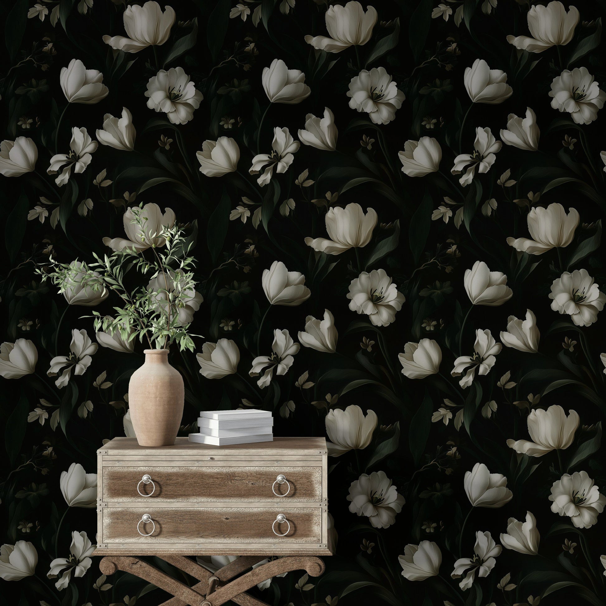 Transform your space instantly with our exquisite Dark Floral Wallpaper featuring elegant white flowers on a deep, moody background. Perfect as a statement wall mural, this high-quality wallpaper effortlessly blends vintage charm and modern sophistication. Made with premium, easy-to-apply materials, our wallpaper guarantees a hassle-free installation, leaving no residue upon removal. Ideal for bedrooms, living rooms, or feature walls, it creates a dramatic and luxurious focal point that elevates any decor style. Upgrade your space today with this stunning floral wallpaper, and transform your room into a sophisticated sanctuary.