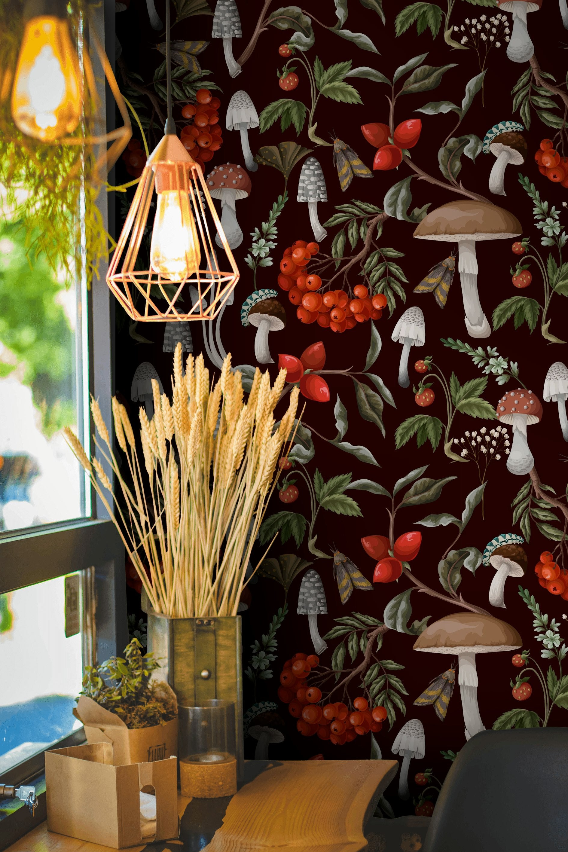 Add enchanting woodland charm to your space with this sophisticated forest wallpaper. Set against a rich burgundy background, this elegant design features delicate white mushrooms, vibrant red berries, wild strawberries, and graceful moths. The deep, moody background creates a luxurious atmosphere while highlighting the intricate botanical illustrations.