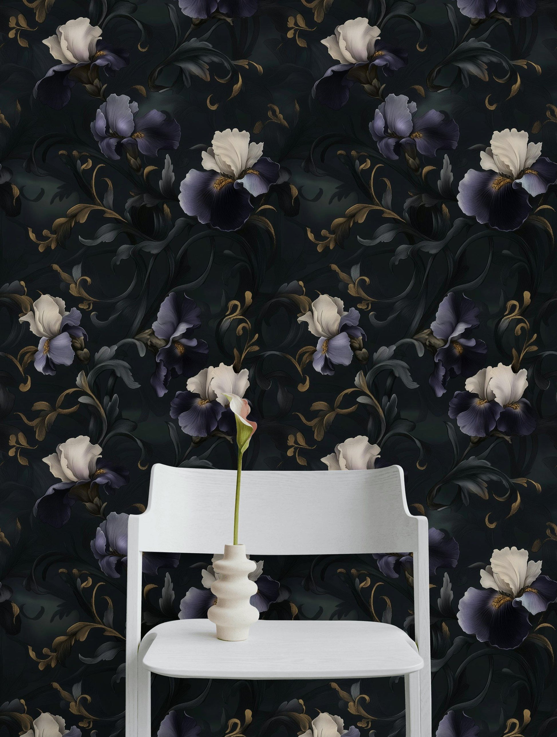 Transform your space with this striking wallpaper featuring elegant purple and ivory iris blooms on a deep, moody background. Subtle gold accents add a touch of luxury, making it the perfect statement piece for living rooms, bedrooms, or offices. Crafted on high-quality material for easy installation and lasting durability, this wall mural brings refined botanical charm to any interior. Elevate your décor with its sophisticated blend of bold color, intricate detail, and timeless floral design.