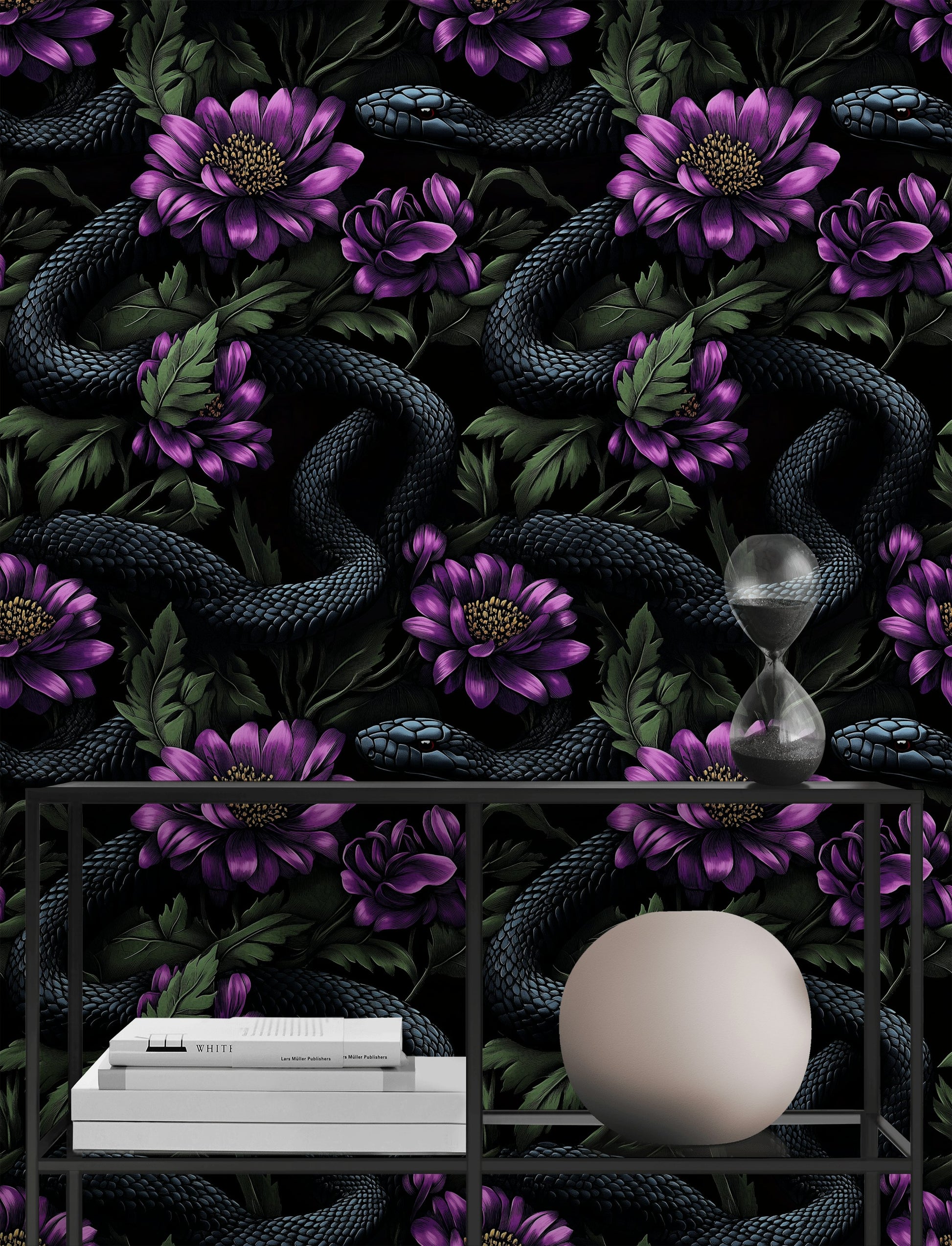 Transform your space with this dramatic dark wallpaper featuring intricate purple flowers intertwined with a sleek, detailed snake. Perfect for accent walls, bedrooms, or creative interiors, this design blends boldness with elegance. The vibrant colors and intricate details add depth and sophistication, making it ideal for modern, gothic, or eclectic décor. Available in peel-and-stick or traditional paste for easy installation. Add a touch of mystery and nature-inspired artistry to your home.