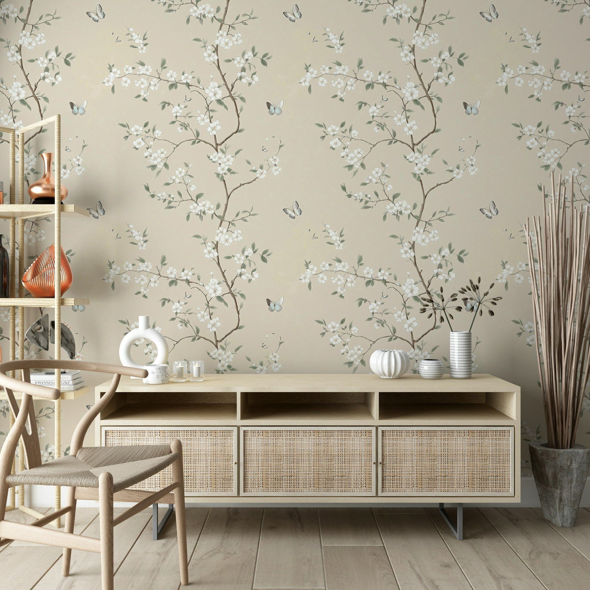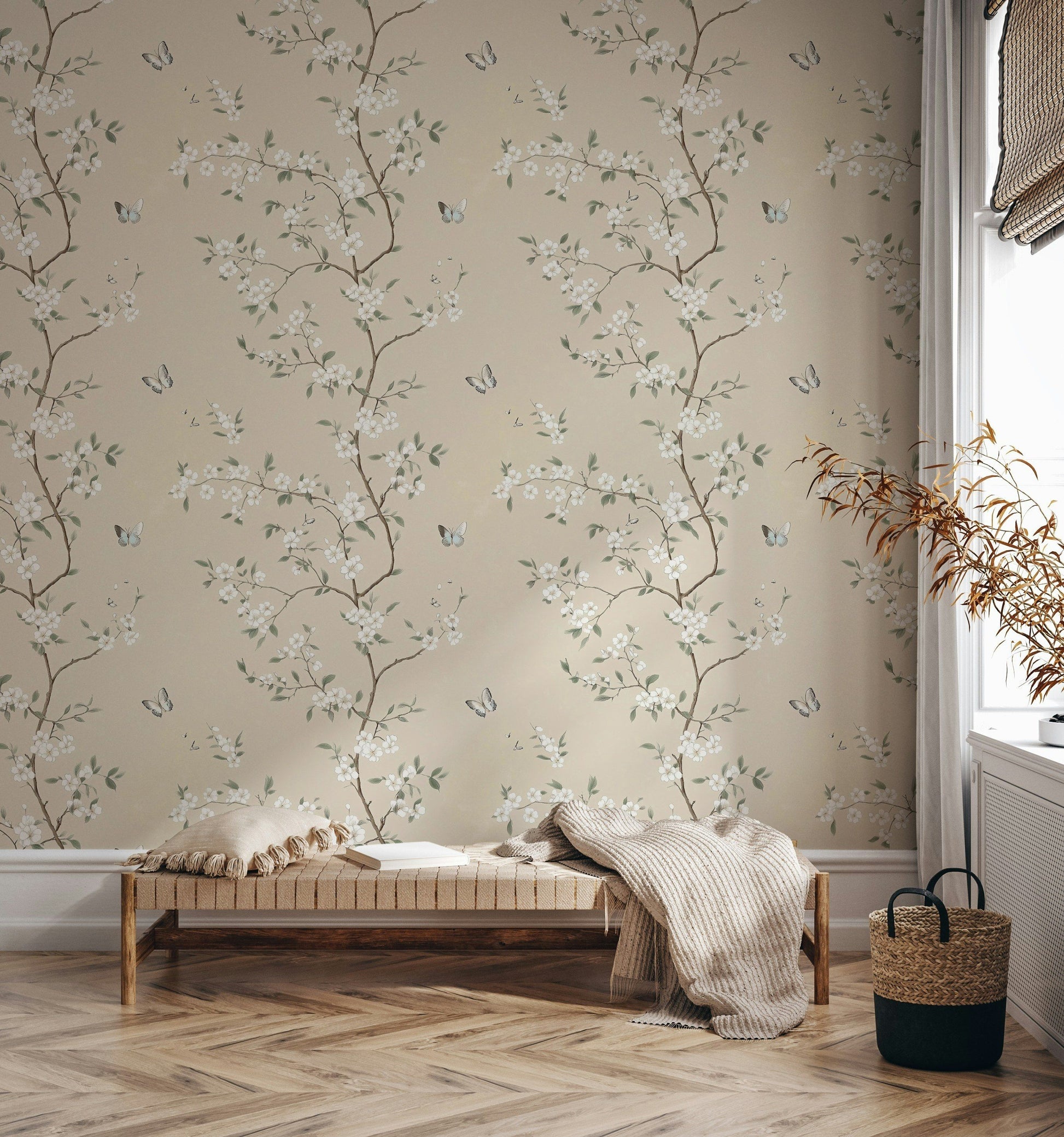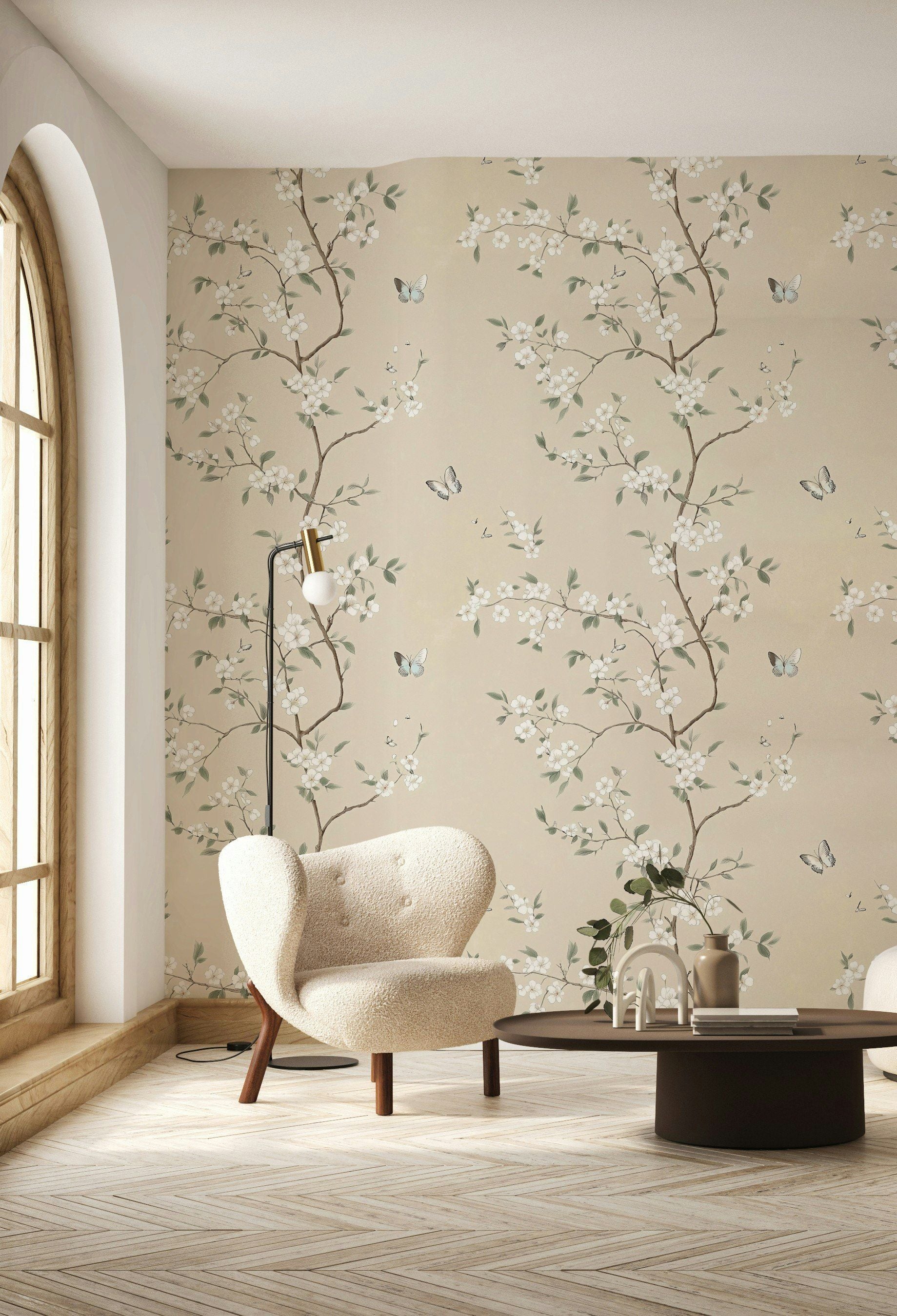 Elevate your space with this delicate and minimalist wallpaper featuring thin branches adorned with soft blossoms and fluttering butterflies. Set against a neutral beige background, this design exudes a serene and calming atmosphere, perfect for creating a tranquil environment in your home. Ideal for bedrooms, living rooms, or nurseries, this peel and stick wallpaper is easy to apply and remove, allowing you to effortlessly refresh your decor with a touch of nature-inspired elegance.