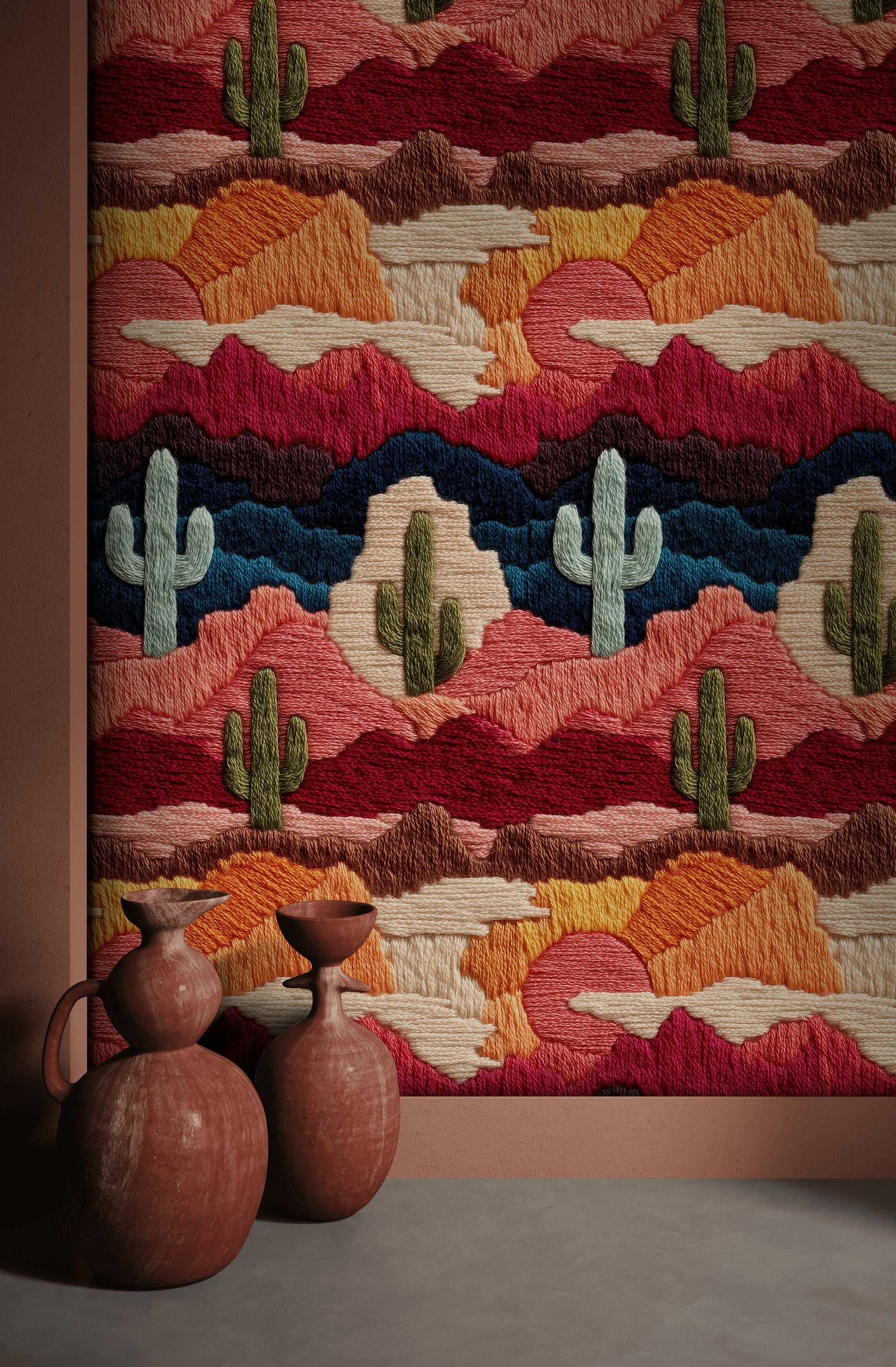 This wallpaper features embroidered landscape art with colorful decor, including bold cactus motifs and layers of sunset wall hues. The peel and stick design brings textured mural details and playful Southwest flair to accent walls or creative spaces. Cactus wallpaper in coral, ochre, and navy is easy to apply and removable, making it suitable for both kids’ rooms and eclectic interiors. Each section captures the vibrant desert mural look, blending modern style with embroidered wall artistry.