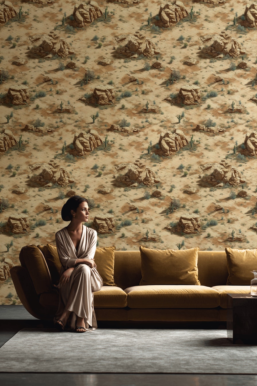 This design includes a serene desert scene with cacti and rocks in beige and green tones. The natural style and geometric patterns make it suitable for modern decor.