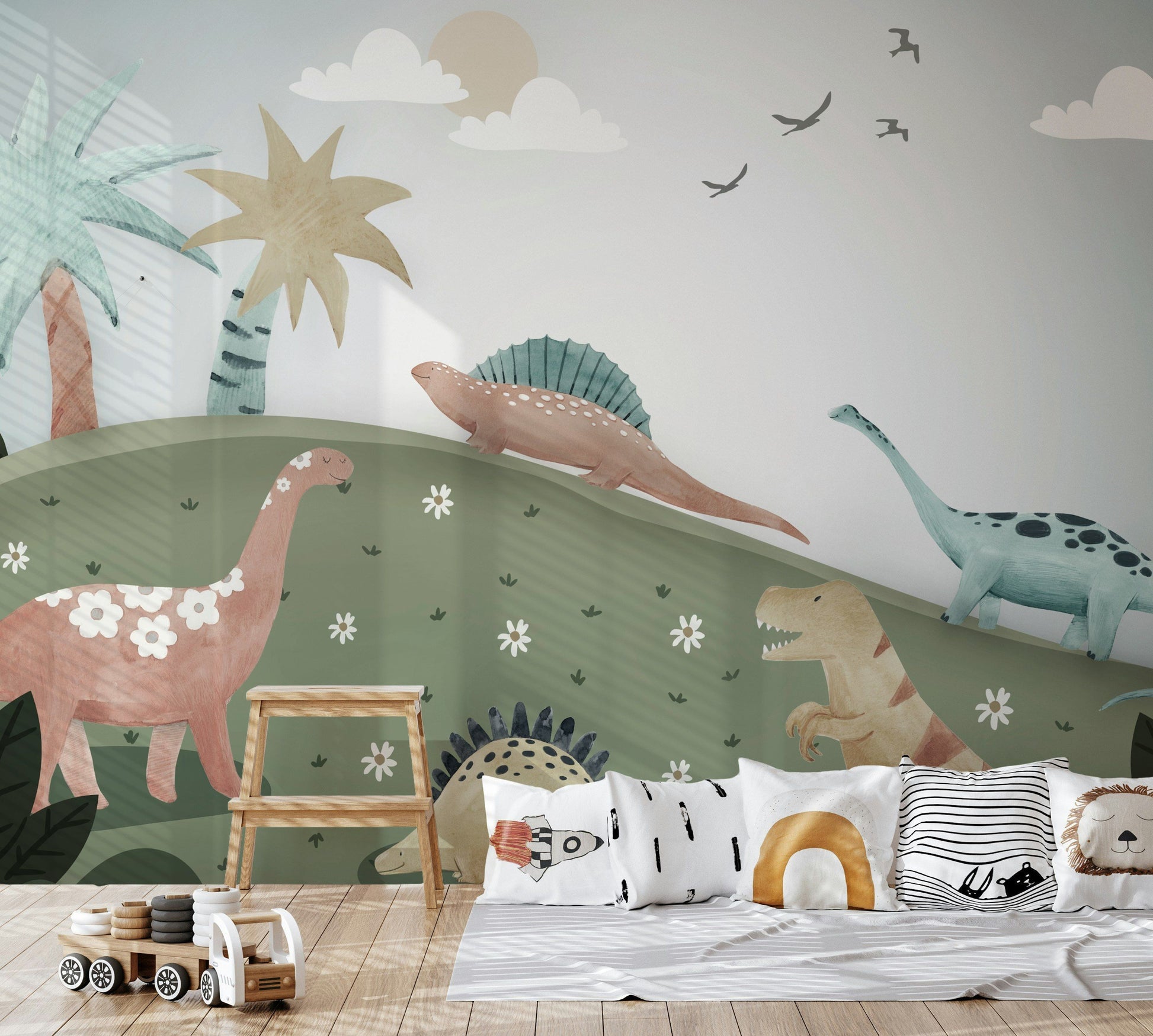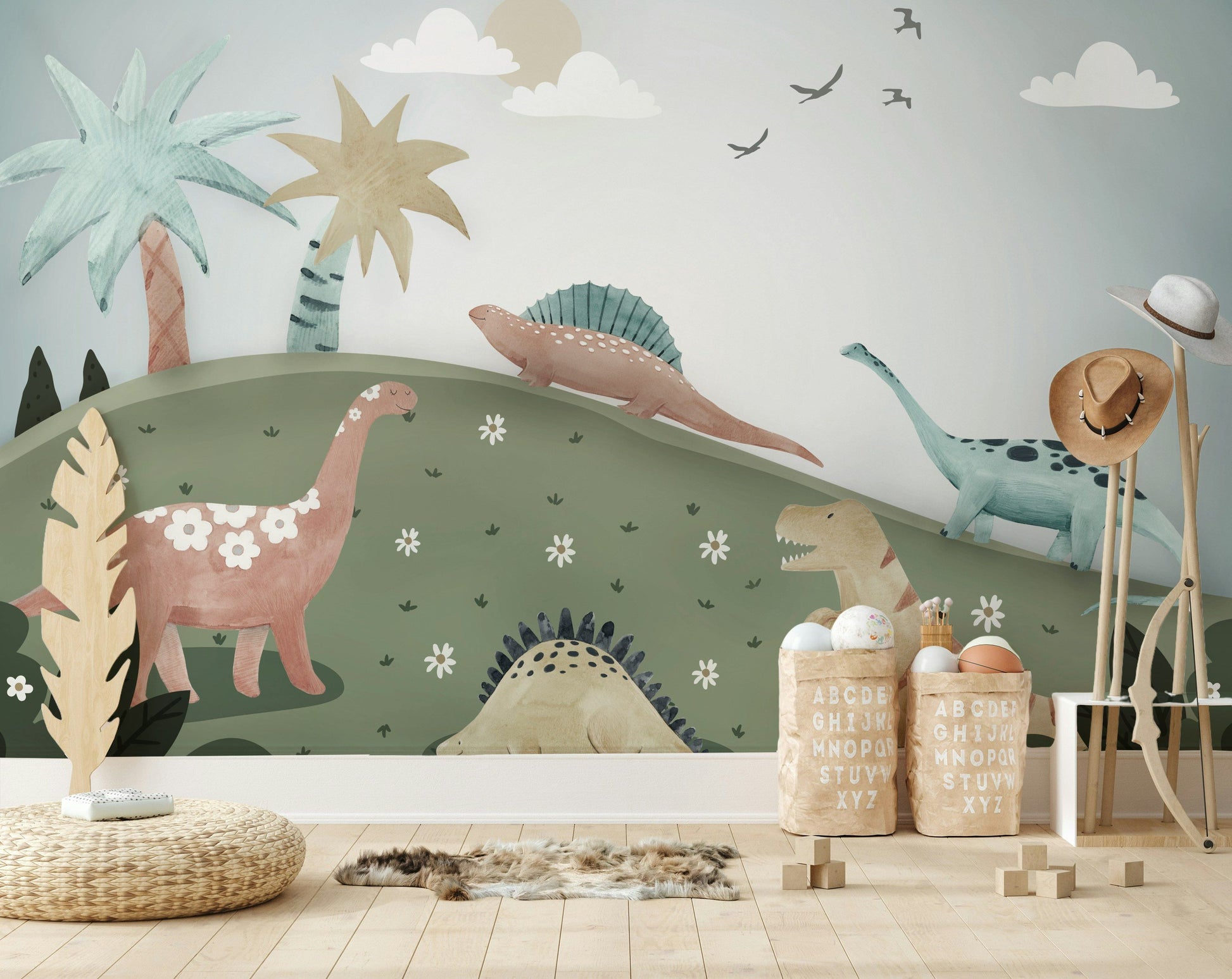 This wall mural shows cartoon dinosaurs on a grassy hill with palm trees, flowers, and birds flying overhead. Featuring dinosaur wallpaper themes and kids room mural detail, it creates a fun prehistoric wall art scene. The design highlights playful wallpaper tones with pastel dinosaur colors, blending dino wall art charm with nursery dinosaur appeal. Perfect as a children mural, it captures the joy of a friendly dinosaur scene in soft hues.